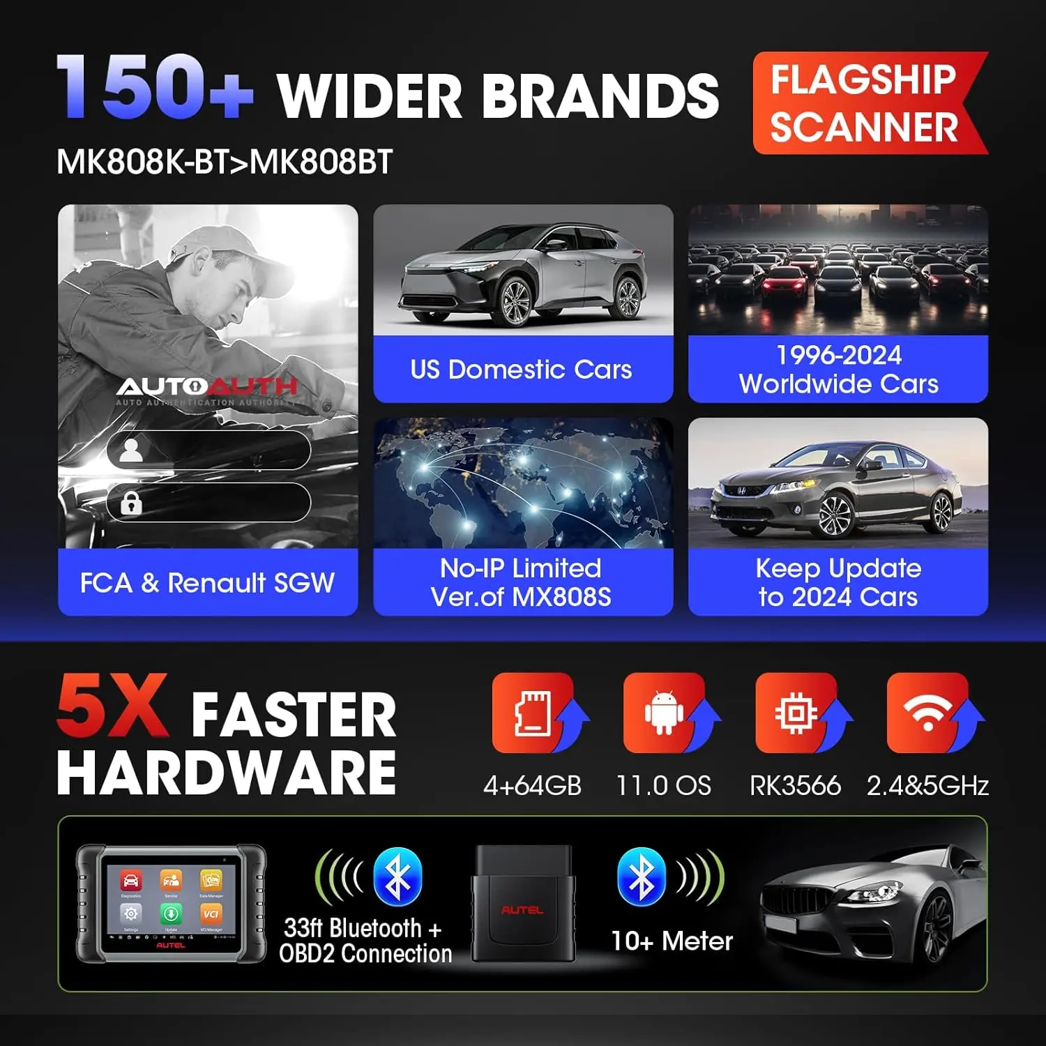 ·B: Level-up of MX808, MK808, MK808BT: Configured with enhanced hardware, Autel MK808K-BT operates 5x faster efficiency and boosts new diagnostic leap: 33FT BT Connection provides stable wireless communication; Android 11 OS runs faster speed; ROCKCHIP RK3566 CPU handles multiple diagnostic tasks orderly; 4GB & 64GB Memory gives larger storage; etc.