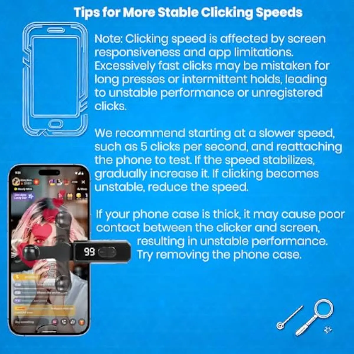 107 Adjustable Clicking SpeedsFrom 99 clicks per second to 1 click every 9 seconds. (Rapid clicking performance is subject to limitations of phone performance and apps.) Perfect for TikTok live stream likes, mobile games requiring fast tapping, e-book page turning, and grabbing limited-edition products/tickets. Frees up your hands.