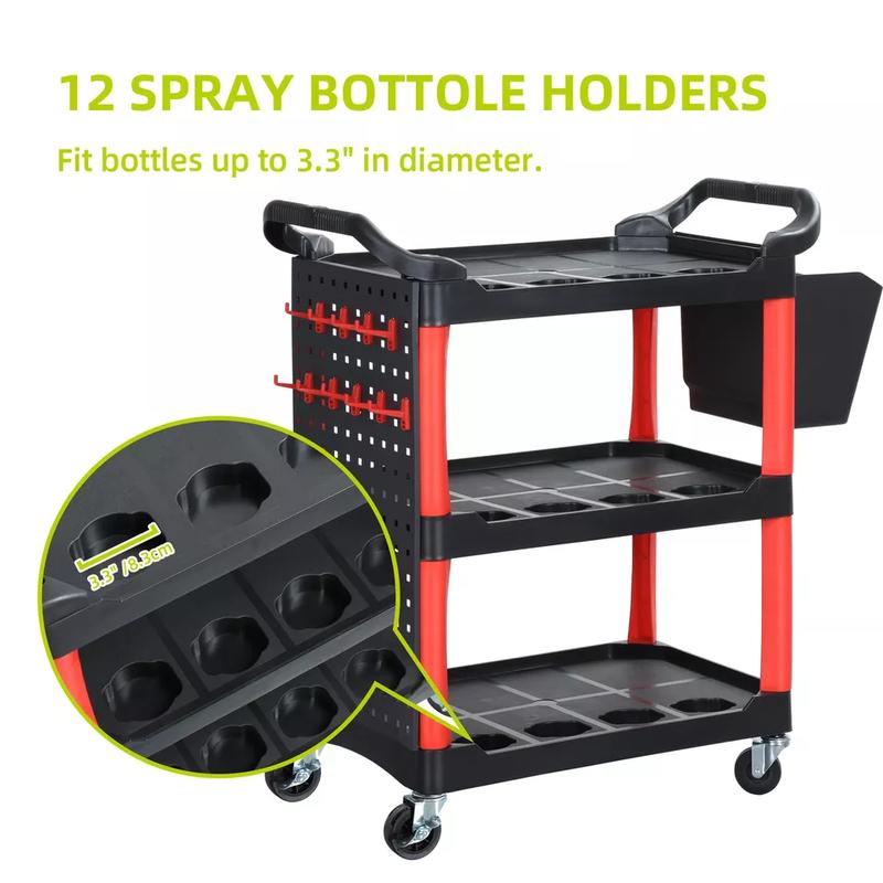 HUMANIZED DESIGN: Our auto detail cart is equipped with 1 long pegboard with hooks and 1 hanging bucket to easily hang tools; with ergonomic comfort handles on both sides for convenient, easy pushing of the cart; has 12 spray bottle holders; comes with two lockable universal wheels that can be easily opened or closed with just a single step on the wheel locks.