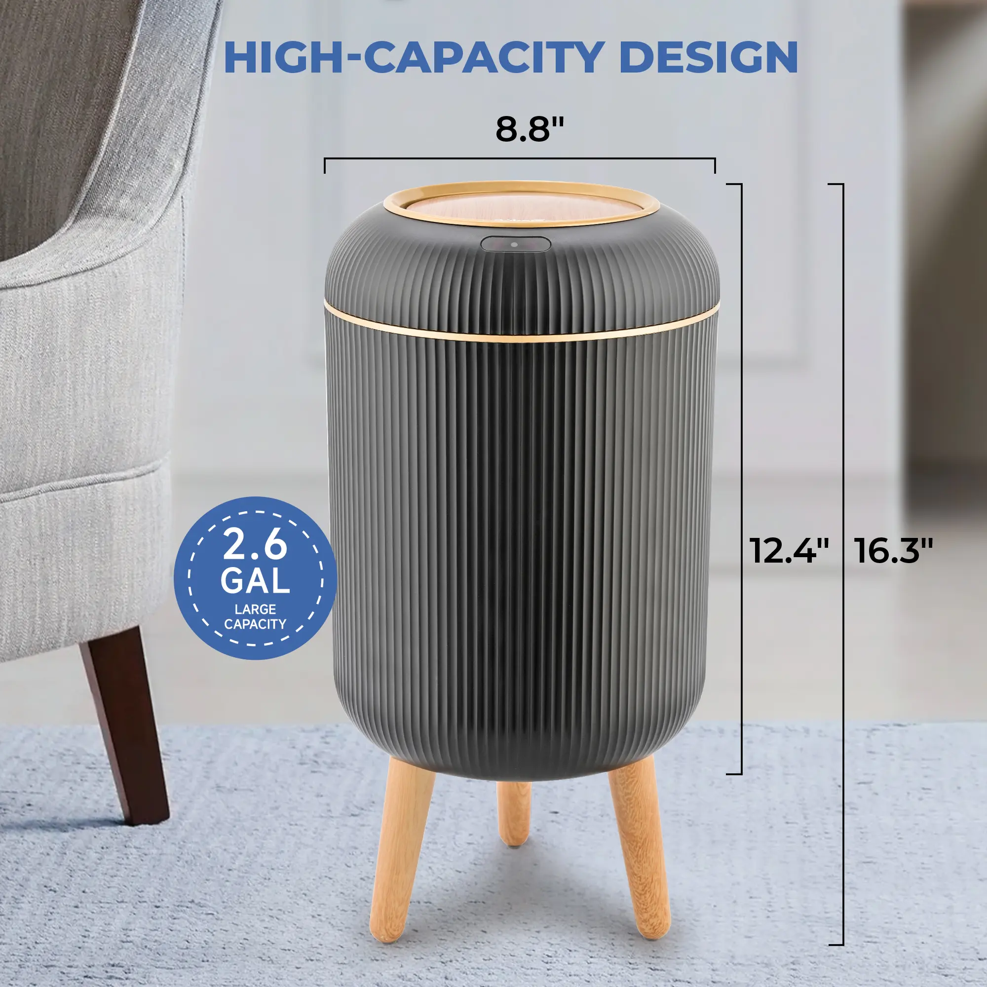 ·【NORDIC MODERN DESIGN】 - 8''L×8''W×16.3''H, 2.6 Gallons, durable ABS materials. 2 AA batteries (NOT INCLUDED). The simple appearance of this garbage can is more beautiful than the traditional trash can. The Nordic Modern design looks beautiful and clean. It is easy for guests to mistake it for a cute storage box or artwork.