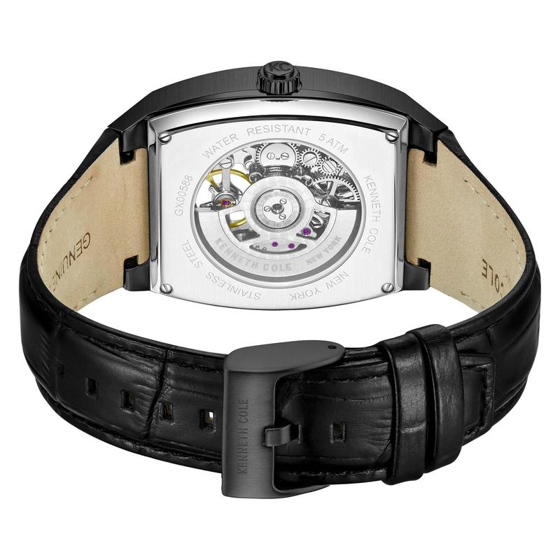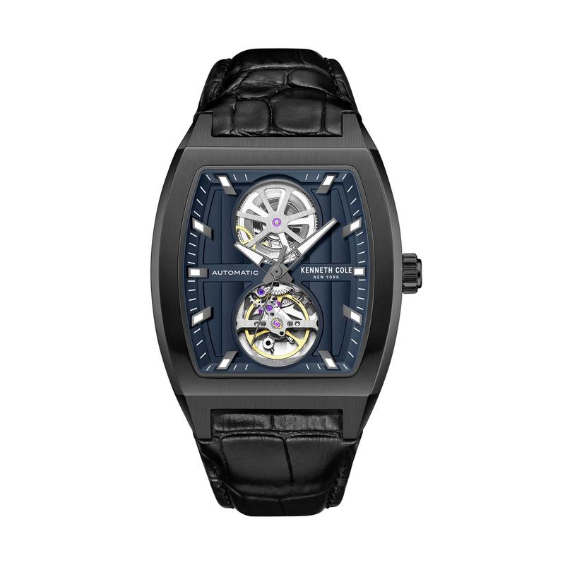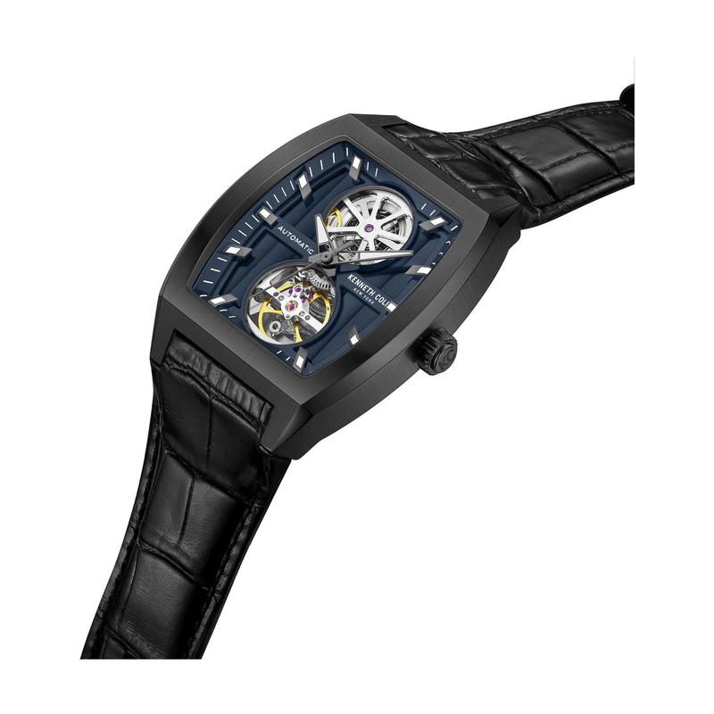 Kenneth Cole New York continues to excel in sophisticated automatic watches with this latest timepiece. Featuring a sleek curved glass and a striking blue dial, it resonates with your unique style. The unconventional dial design with two circular windows offers a captivating glimpse into the mechanical precision within. Paired with a genuine black leather strap, this watch effortlessly blends style and comfort. From Kenneth Cole New York.