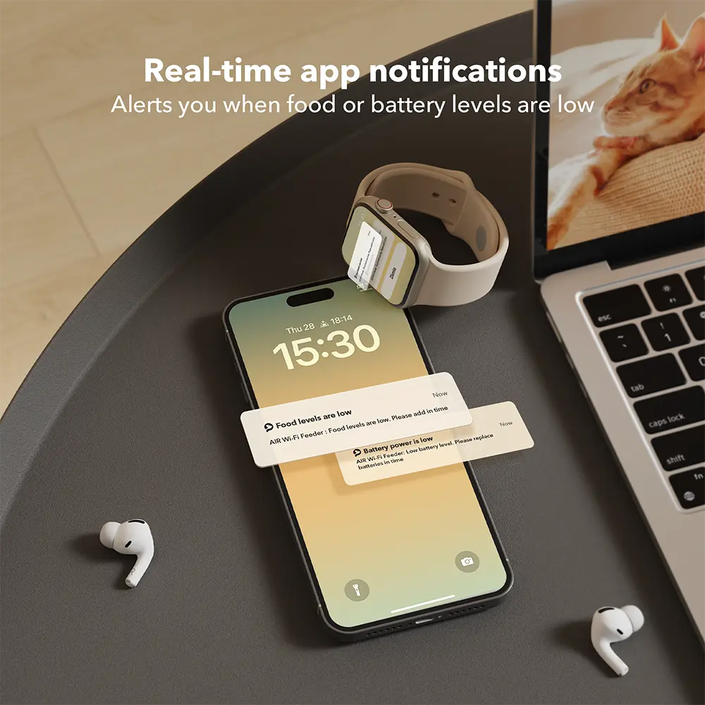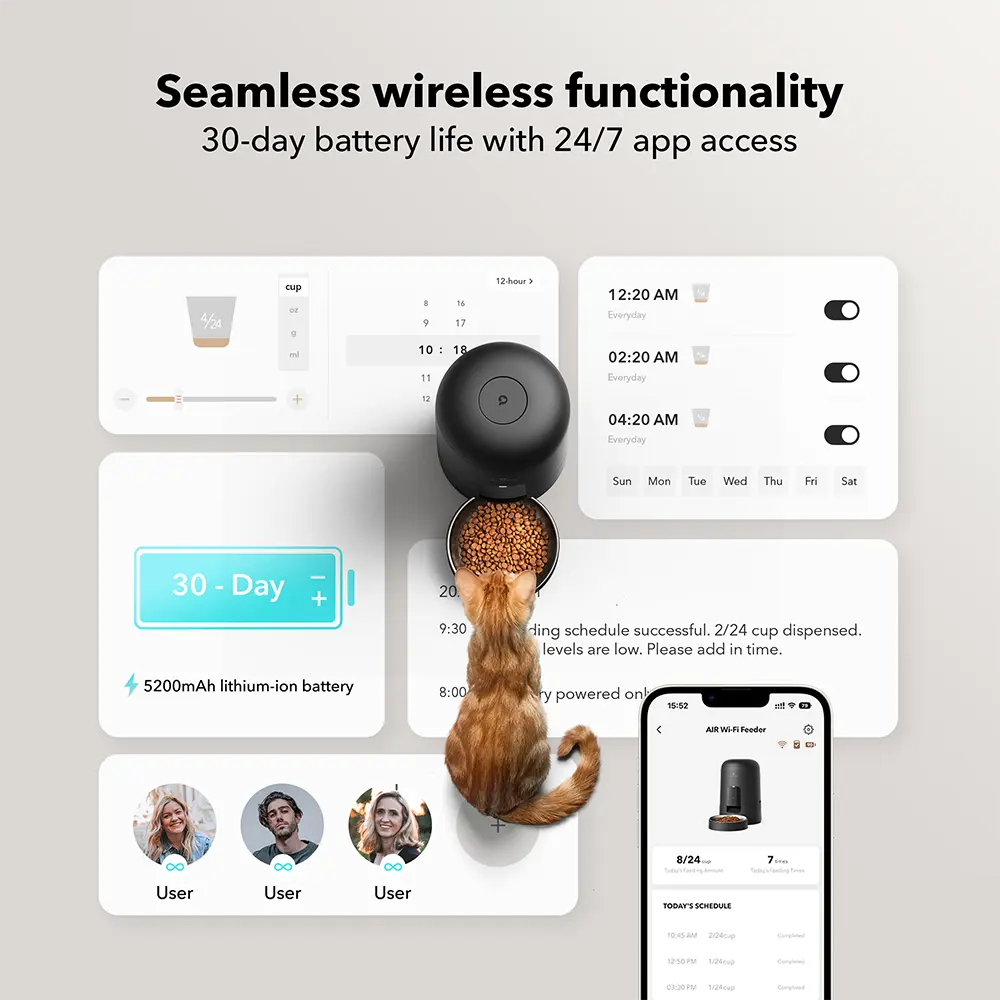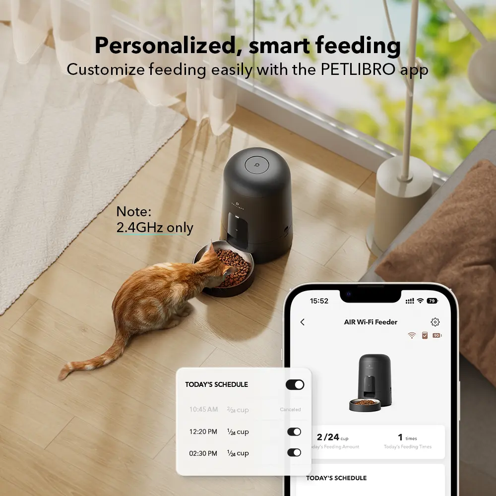 ·Intelligent Feeding: Once the PETLIBRO Air automatic cat feeder is connected to the WiFi, you can easily set or change a customized feeding schedule. This feature simplifies the process of feeding your pet, reducing the effort required.
