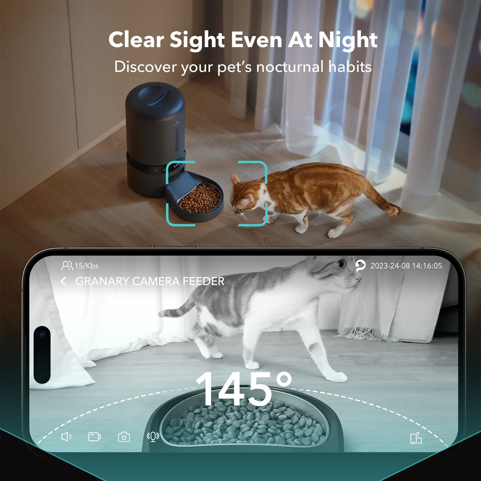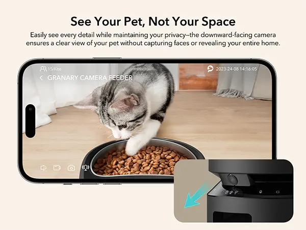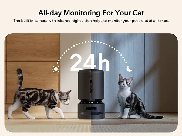 The automatic pet feeder I purchased is equipped with a camera and APP control, allowing me to feed my cats remotely whenever I'm out or traveling. The APP lets me watch them eat in real time with simple operations, which is very convenient. The price is very reasonable for such a high-tech product.