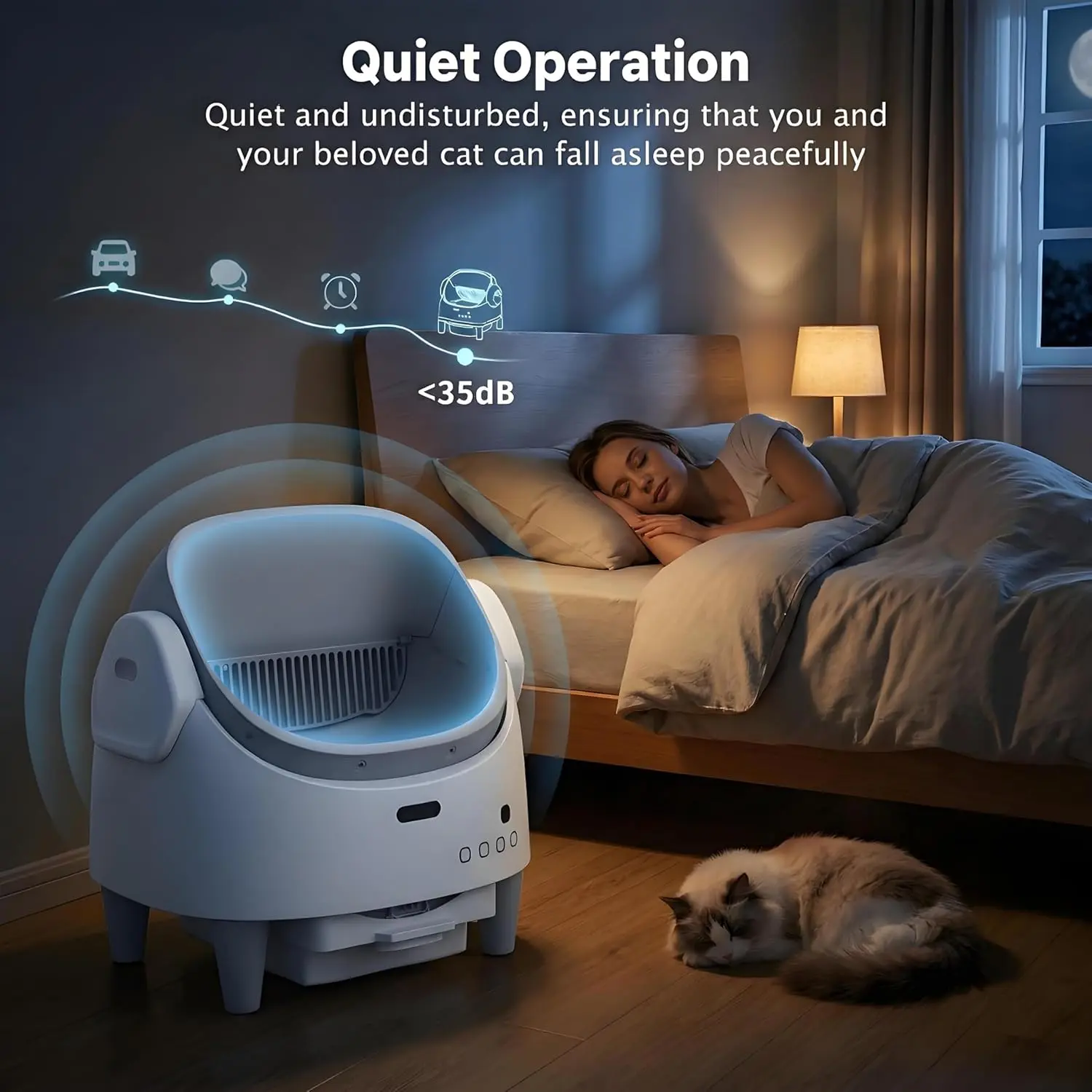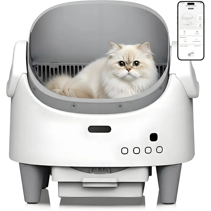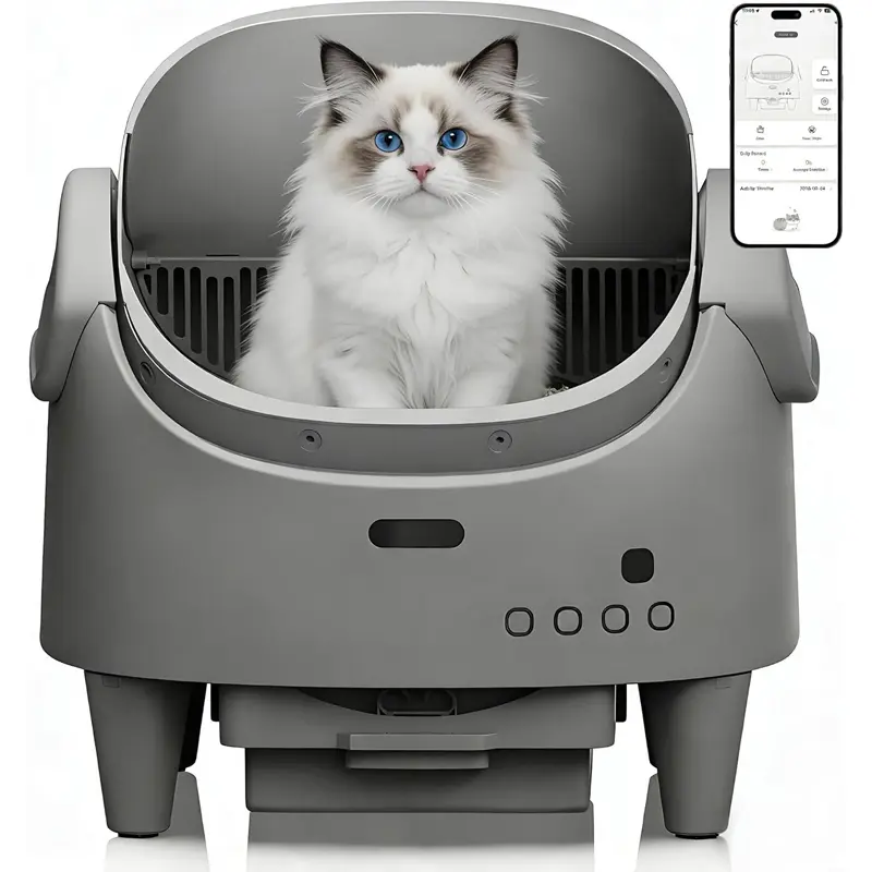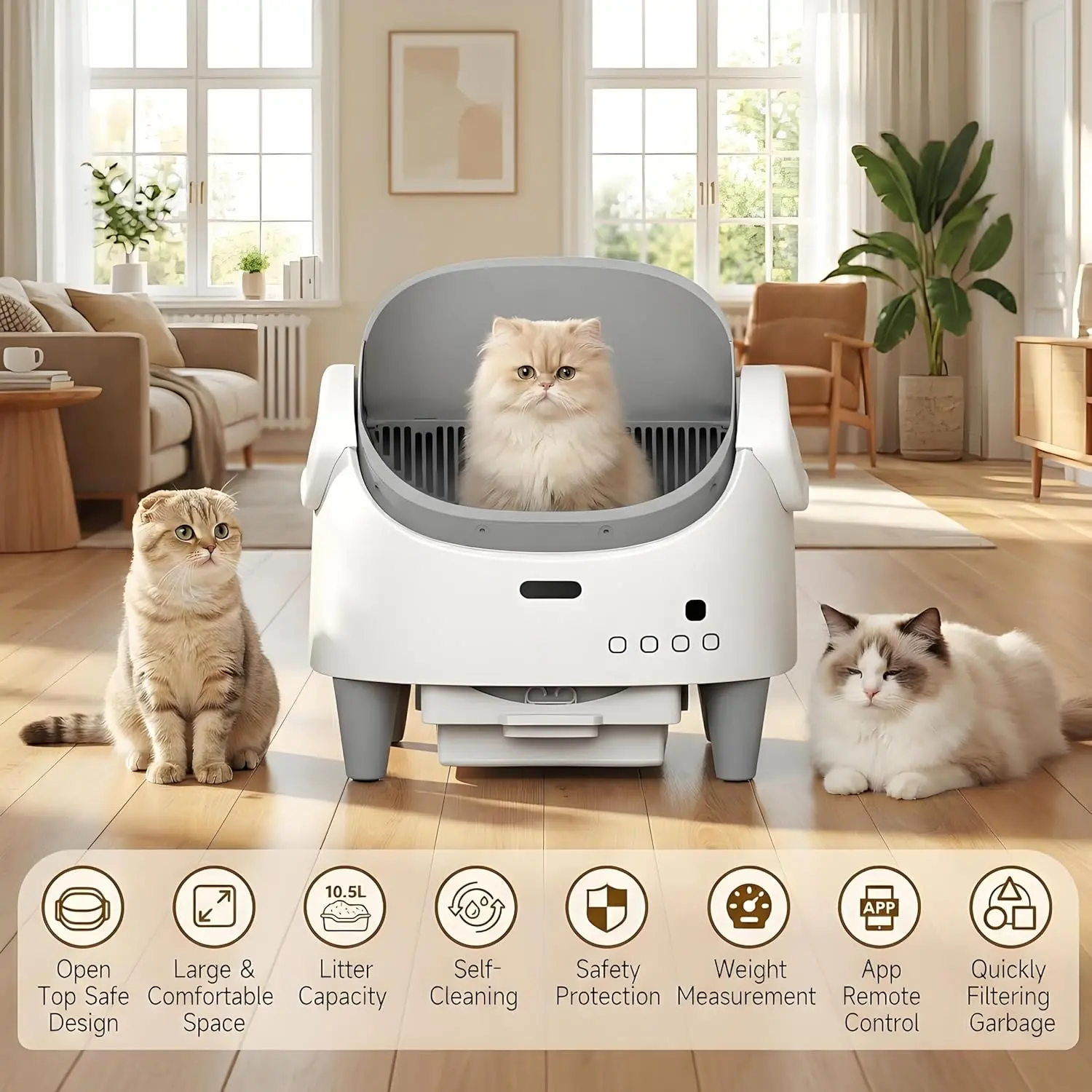 ·【Spacious Top-Open Design for Stress-Free Entry】Unlike cramped, enclosed models, this automatic litter box features an innovative top-open structure with an extra-large entrance. This airy design provides a wide-open field of vision, eliminating the sense of confinement for your pet. It creates a roomy, secure "nest" that encourages even the most anxious cats to enter and exit freely, ensuring maximum comfort during every use.