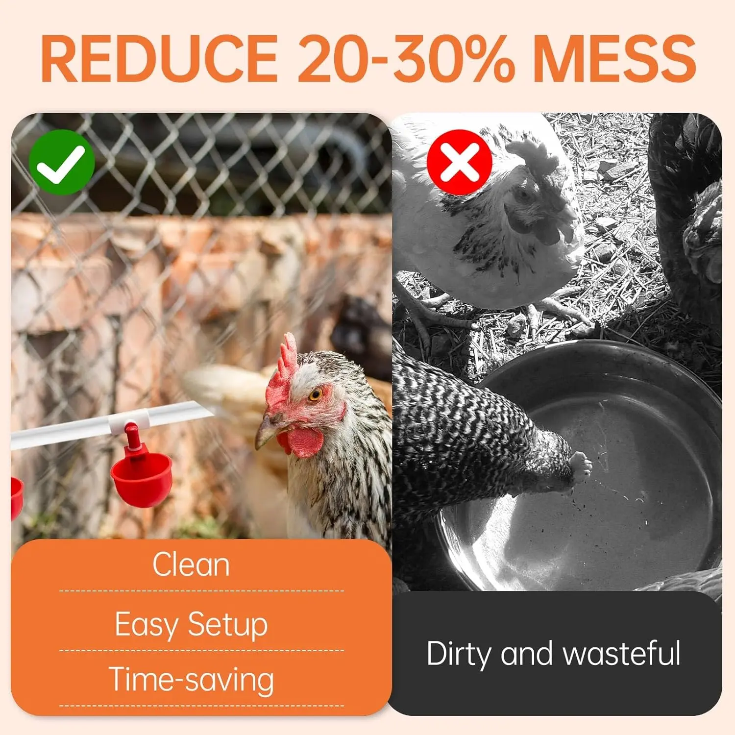 Automatic Chicken Watering System: Our chicken watering system feature a gravity-feed design that refills when it runs out of water, meaning no wasted water and a steady of fresh water for your feathered friends at all times