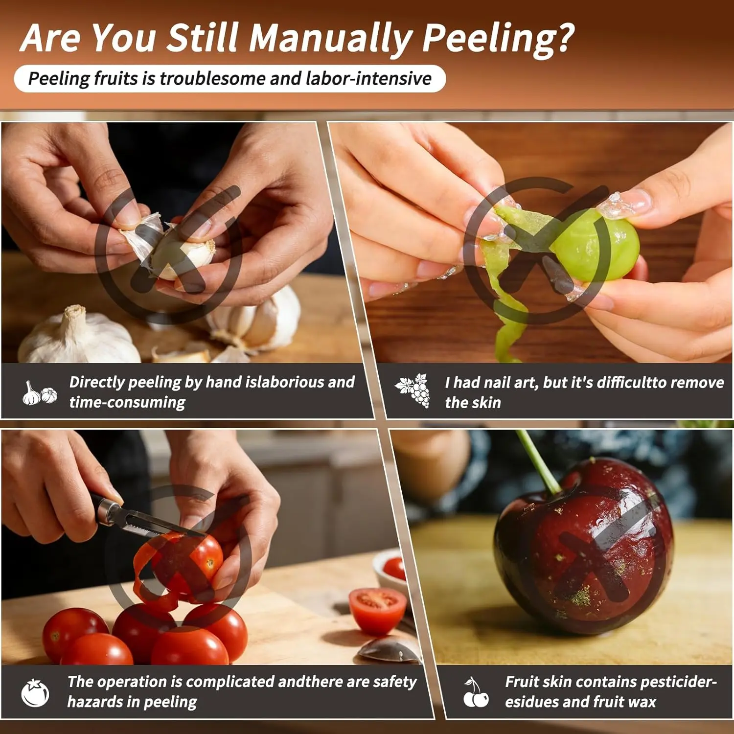 ·Notice: NOT suitable for peeling large fruits and vegetables such as potatoes or apples. Recommended for round or oval fruits weighing no more than 150 grams (5.3 ounces). Read the instructions carefully before use to avoid personal injury and property damage