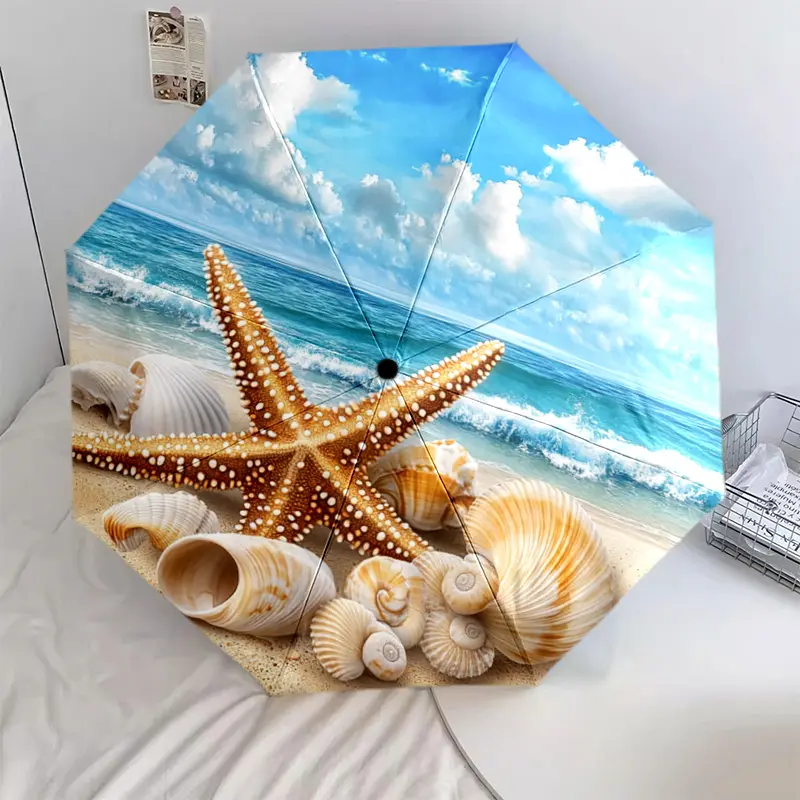 1 PC Automatic Folding Umbrella - Beach Starfish Shells Ocean Waves Pattern, Portable & Foldable Design with 8 Ribs, Merry Christmas Pattern,Casual Outdoor Accessory Halloween and Christmas Birthday Gifts. G00125