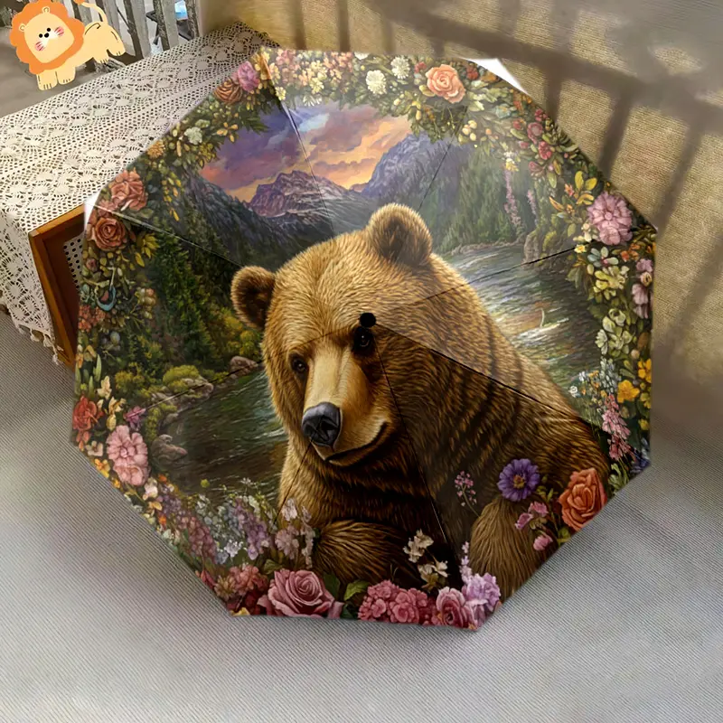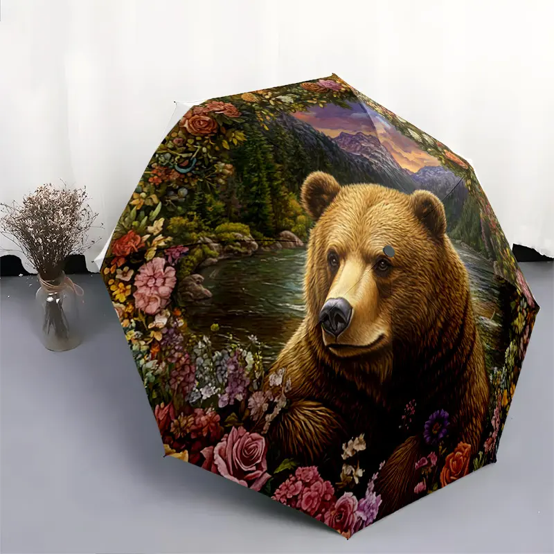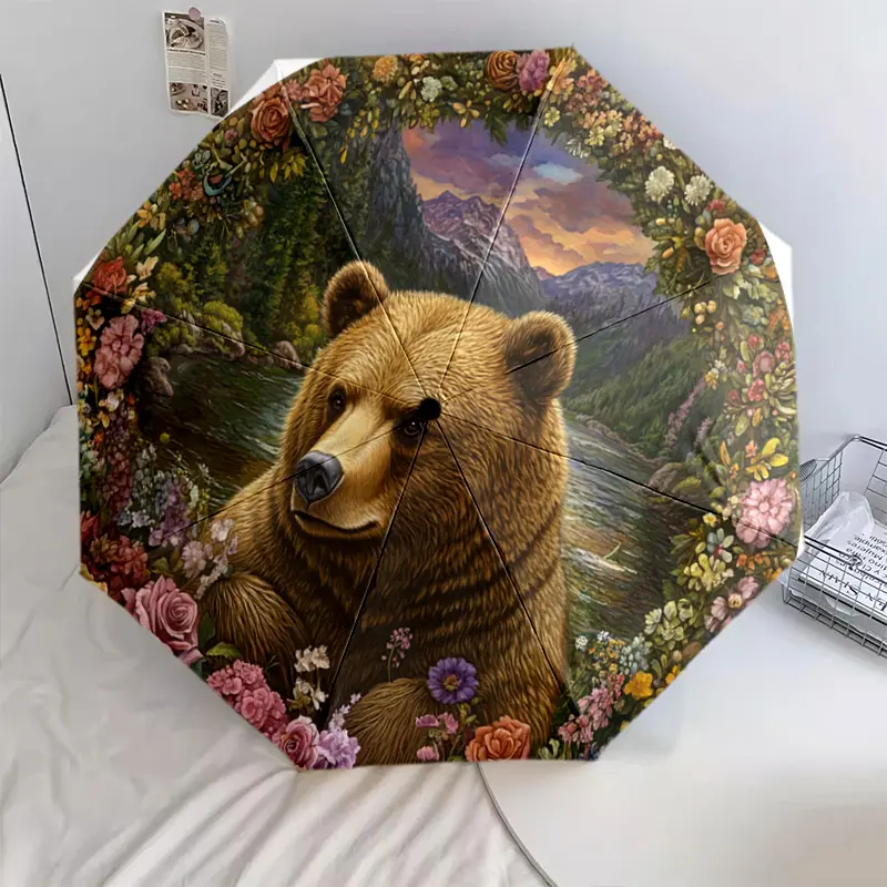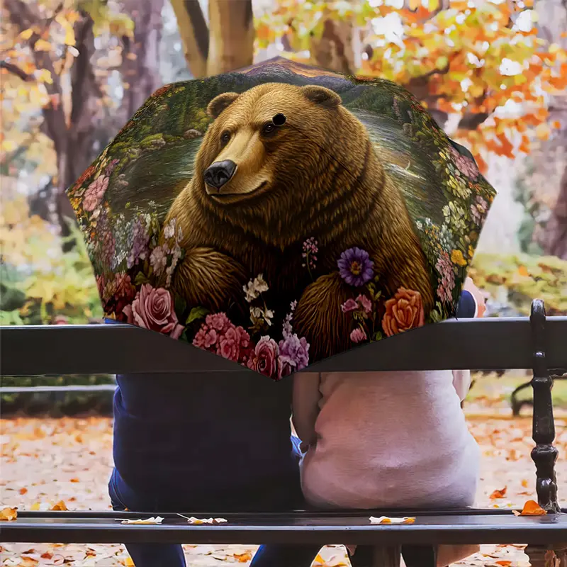 1 PC Automatic Folding Umbrella - Nature's Majesty: A Bear Amidst Flowers Pattern, Portable & Foldable Design with 8 Ribs, Merry Christmas Pattern,Casual Outdoor Accessory Halloween and Christmas Birthday Gifts. G0022
