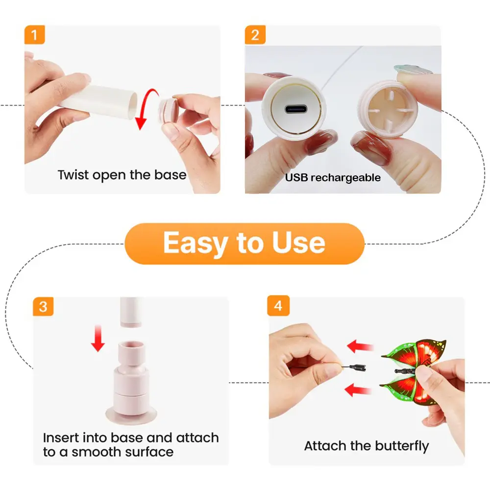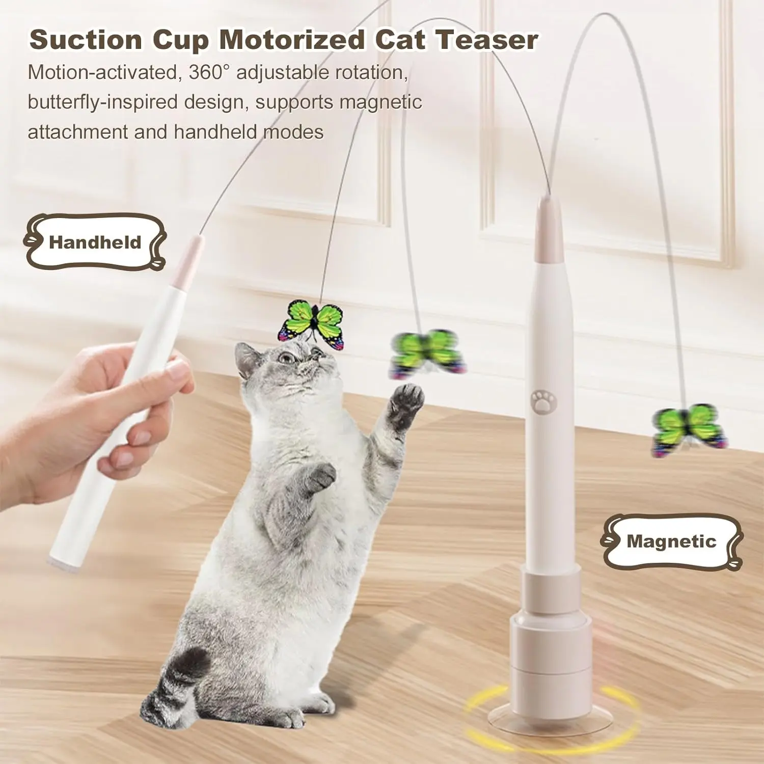 ·Powerful Suction Cup Base & Flexible Play: Equipped with a strong suction cup base that securely attaches to smooth surfaces like tile, wood, and glass. Combined with the feather wand-style butterfly