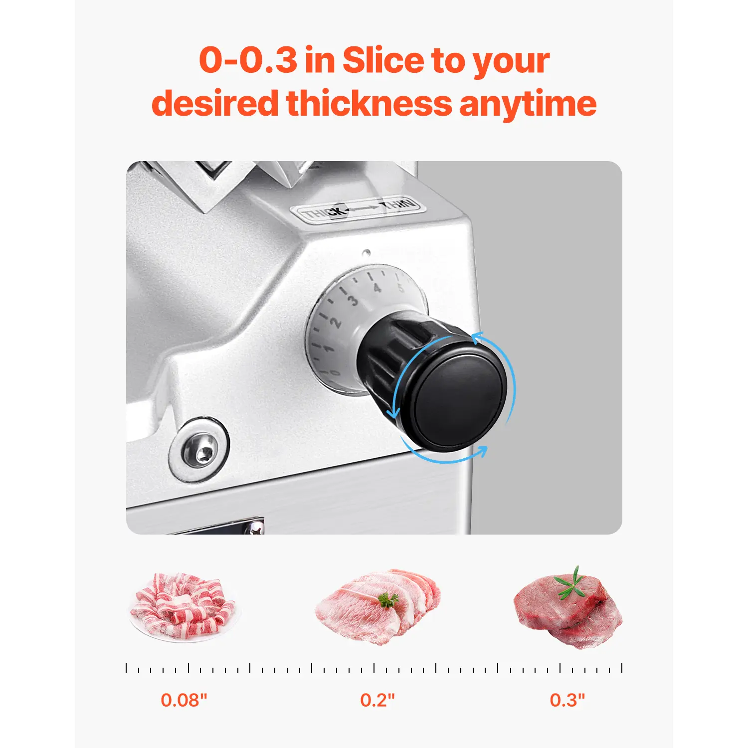 • Adjustable Thickness: The deli slicer features a thickness adjustment knob with a range from 0-0.3 in (0-8 mm). You can easily customize the thickness to meet your preparation needs. Ideal for making hamburgers, sandwiches, cold cuts, fruit platters, and more.