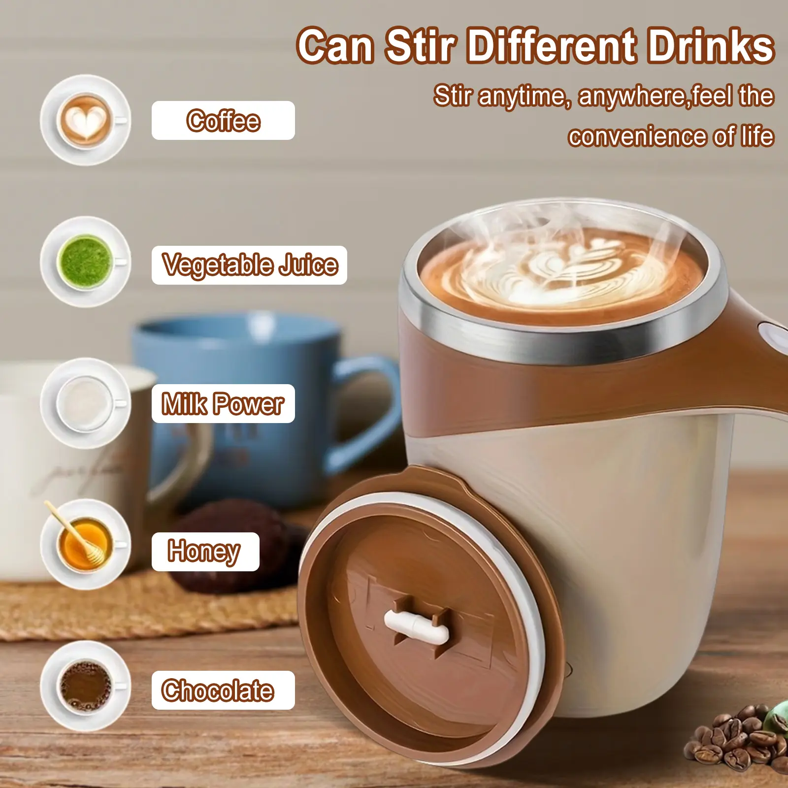 Effortless Mixing at the Touch of a Button Make your coffee breaks smarter and smoother with this automatic magnetic self-stirring mug. Designed to blend coffee, milk, tea, hot chocolate, or protein powder evenly in seconds, it saves time and keeps your drink perfectly mixed from the first sip to the last.