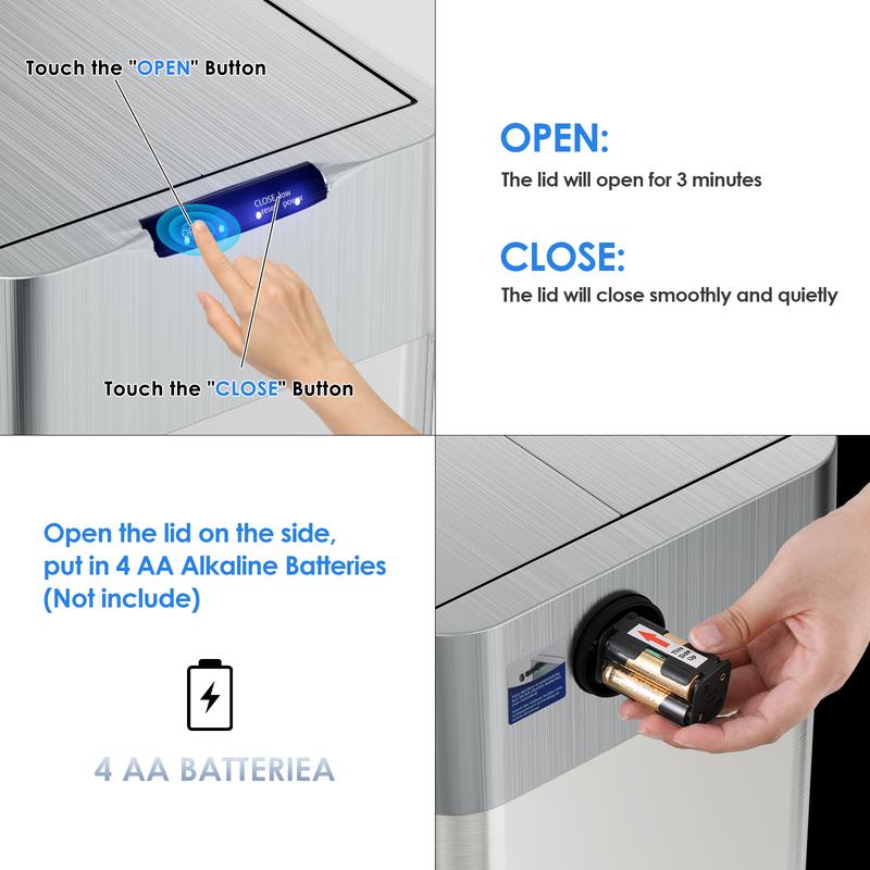 ·POWER OPTIONS: Powered by 4*1.5v AA size batteries for continuous power for large trash can with lid. Consumers need to purchase 4*1.5v AA batteries (not included) to install and use it by themselves.