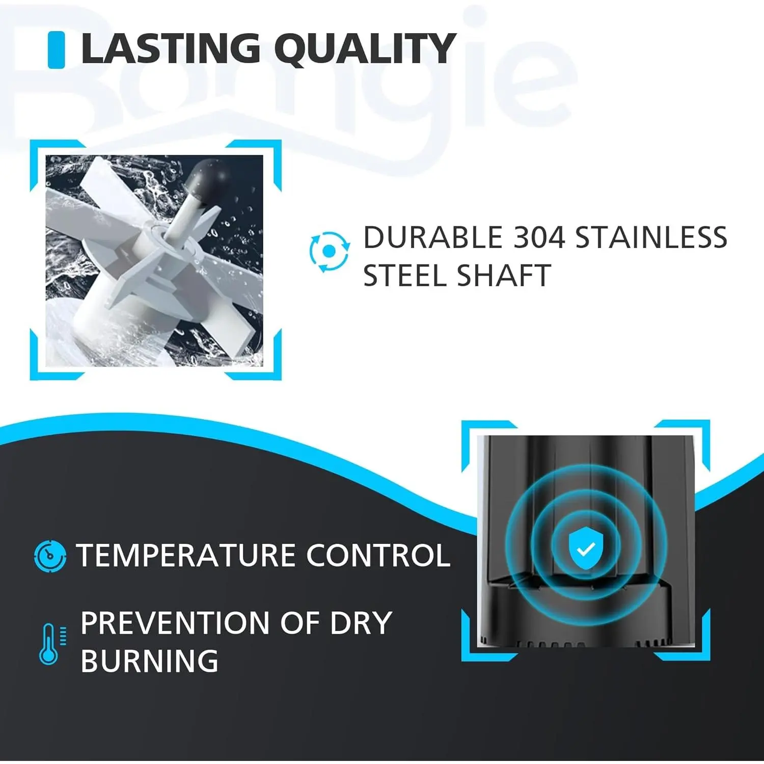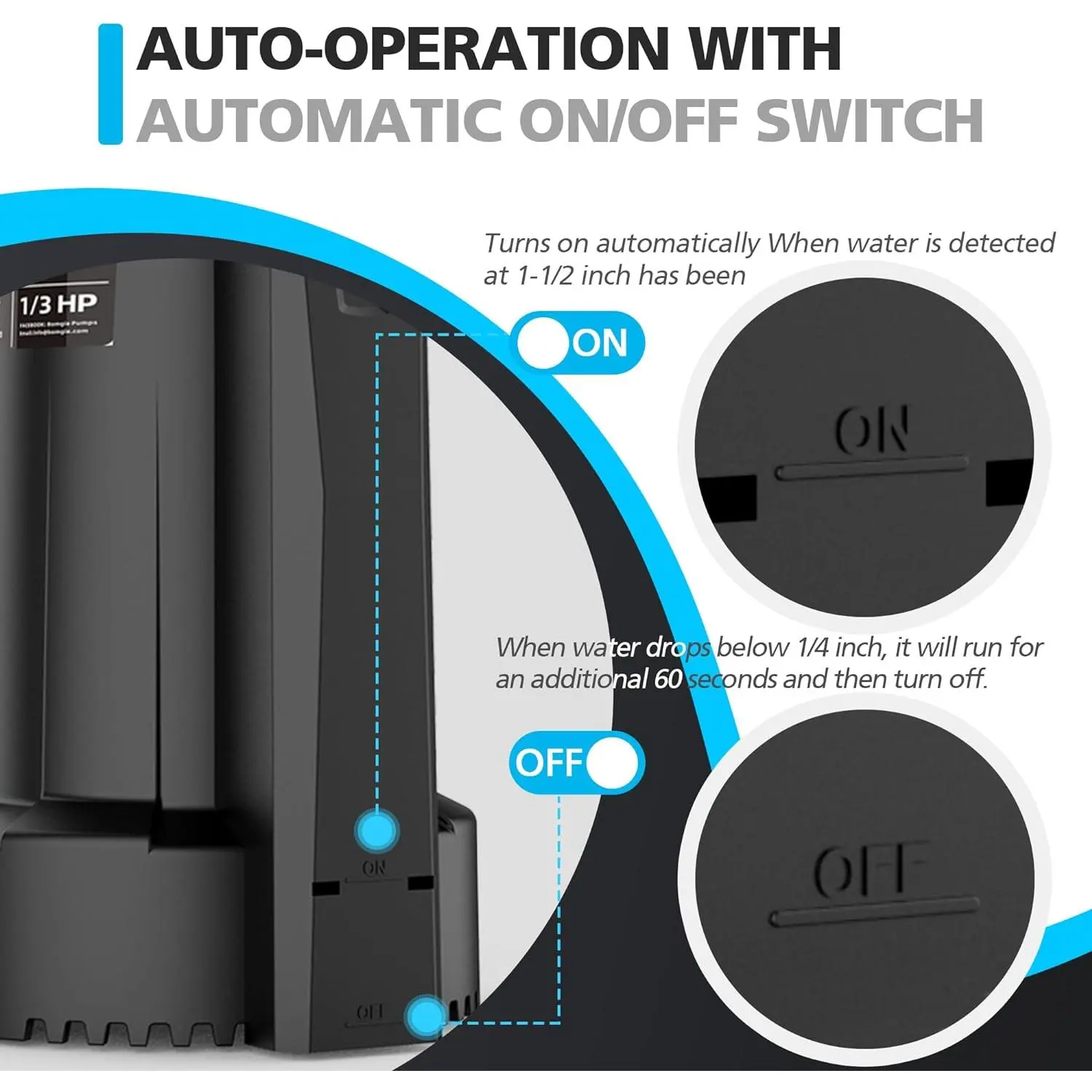 Automatic On/Off : Automatic water pump has a automatic . It will automatically turn on when water has been detected at 1-1/ 2". When the pump remove water to approximately 1/4 ", the pump will run for additional 60 seconds and then turn off
