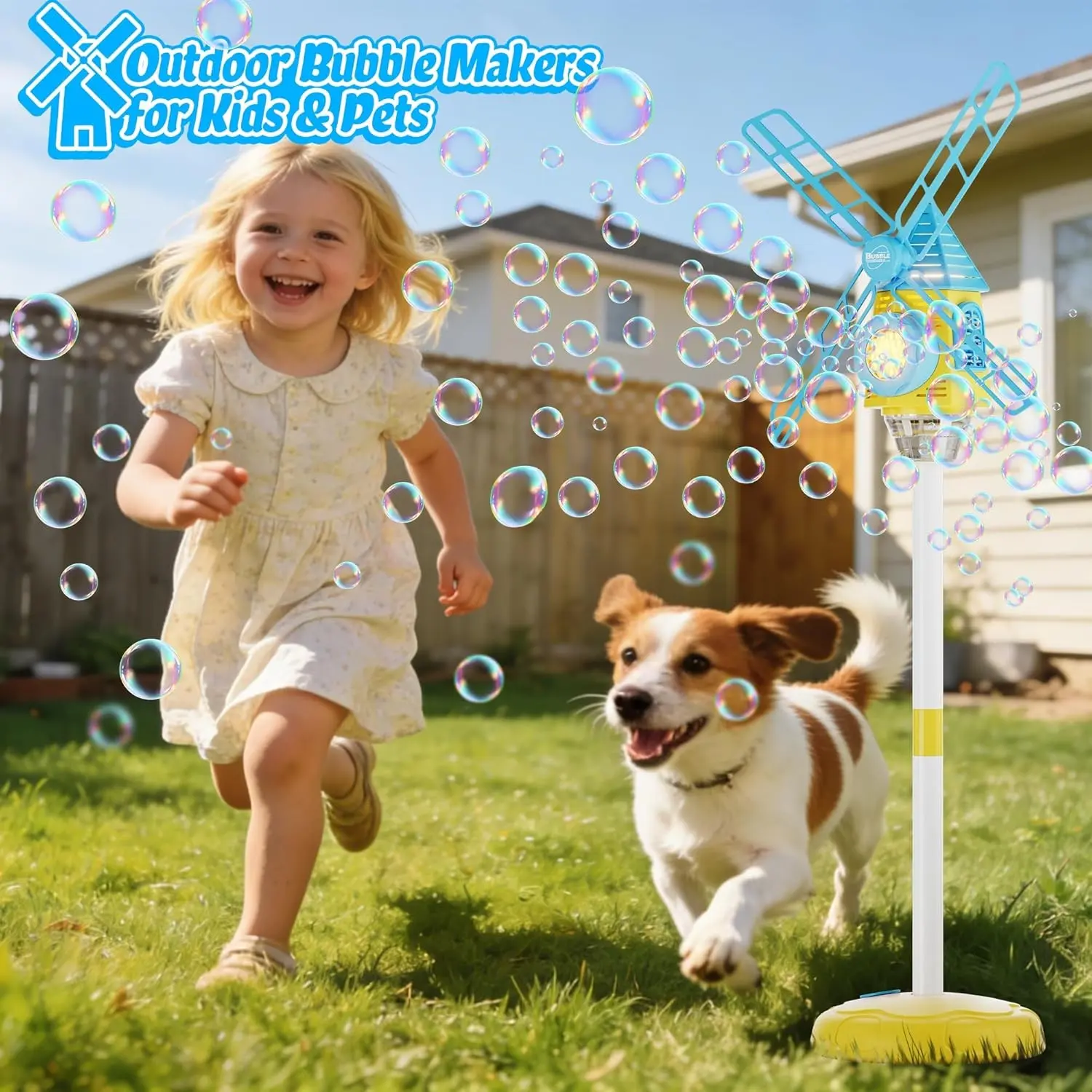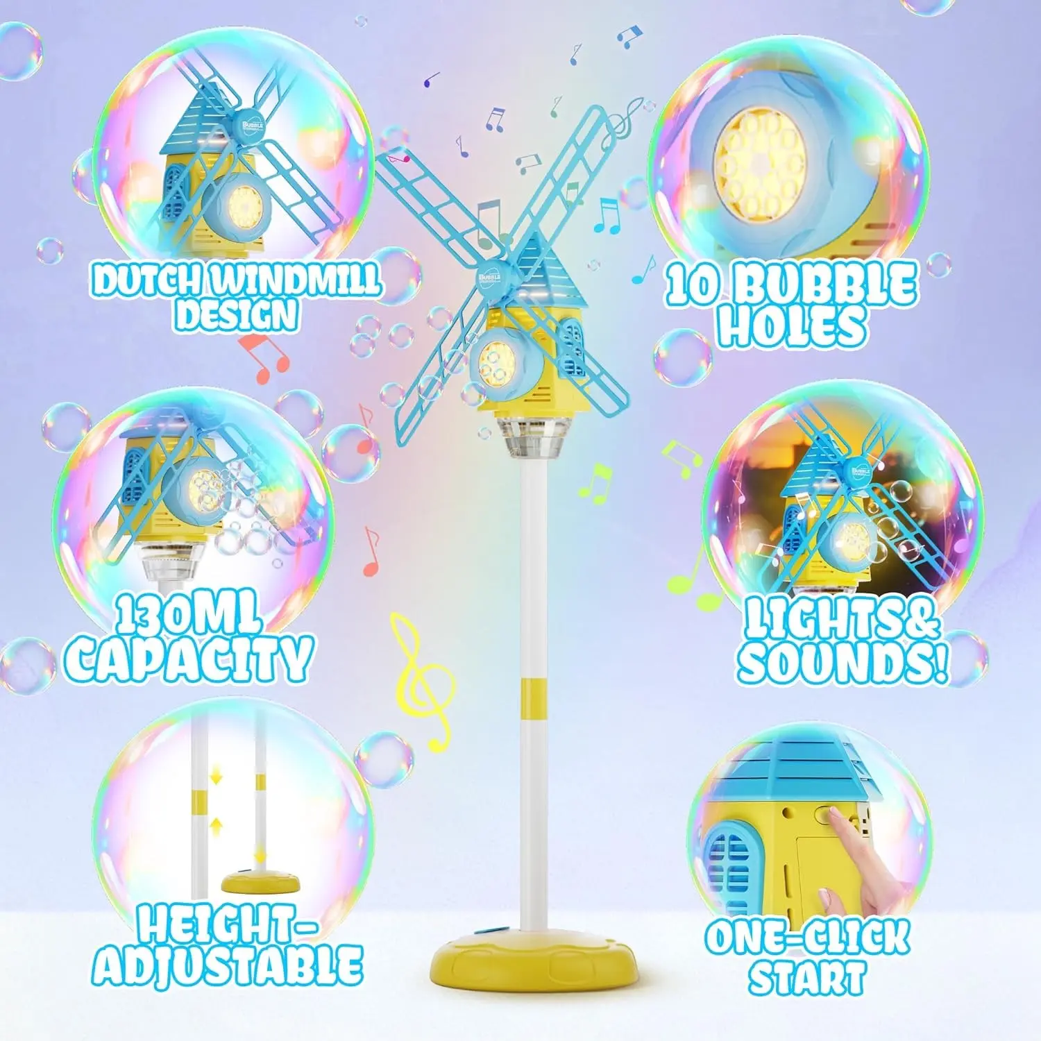 Automatic Windmill Bubble Machine, Adjustable Height, Colorful Lights, Music, Indoor Outdoor Use, Gift for Kids
