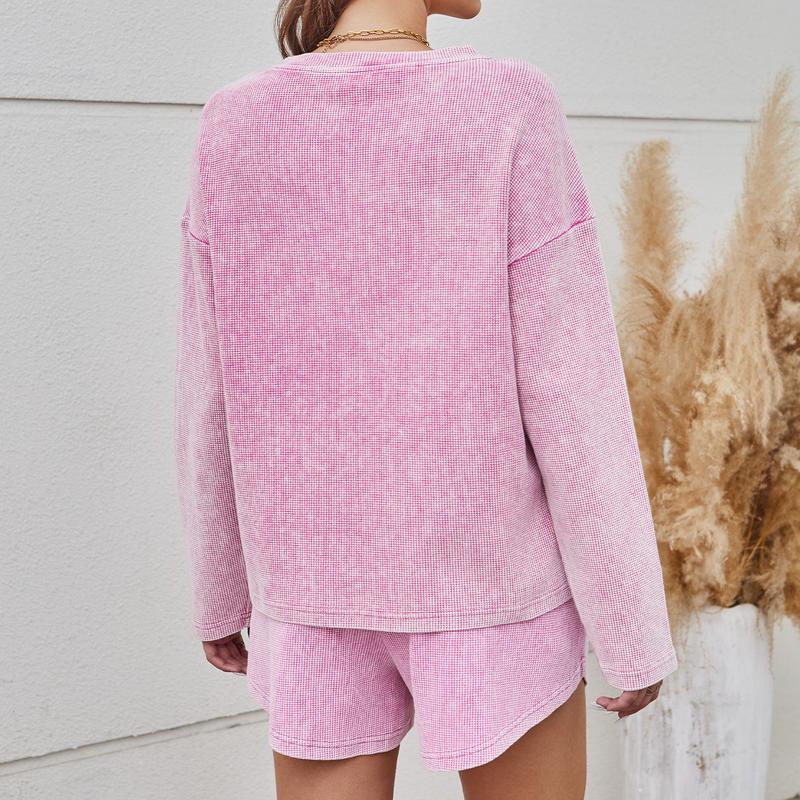 AUTOMET Vintage Waffle 2 PIECE SET WOMEN Lounge Long Sleeve Tops Fitted with Crew Neck & Relaxed Sweatshorts Fallreshness