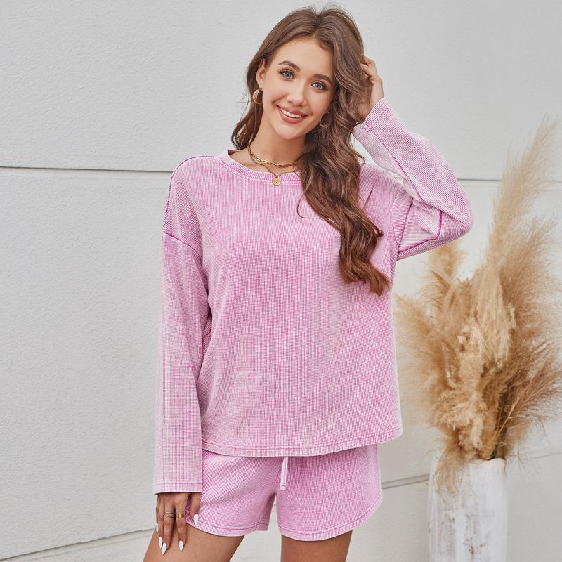 5. AUTOMET Vintage Waffle 2 PIECE SET WOMEN Lounge Long Sleeve Tops Fitted with Crew Neck & Relaxed Sweatshorts Fallreshness