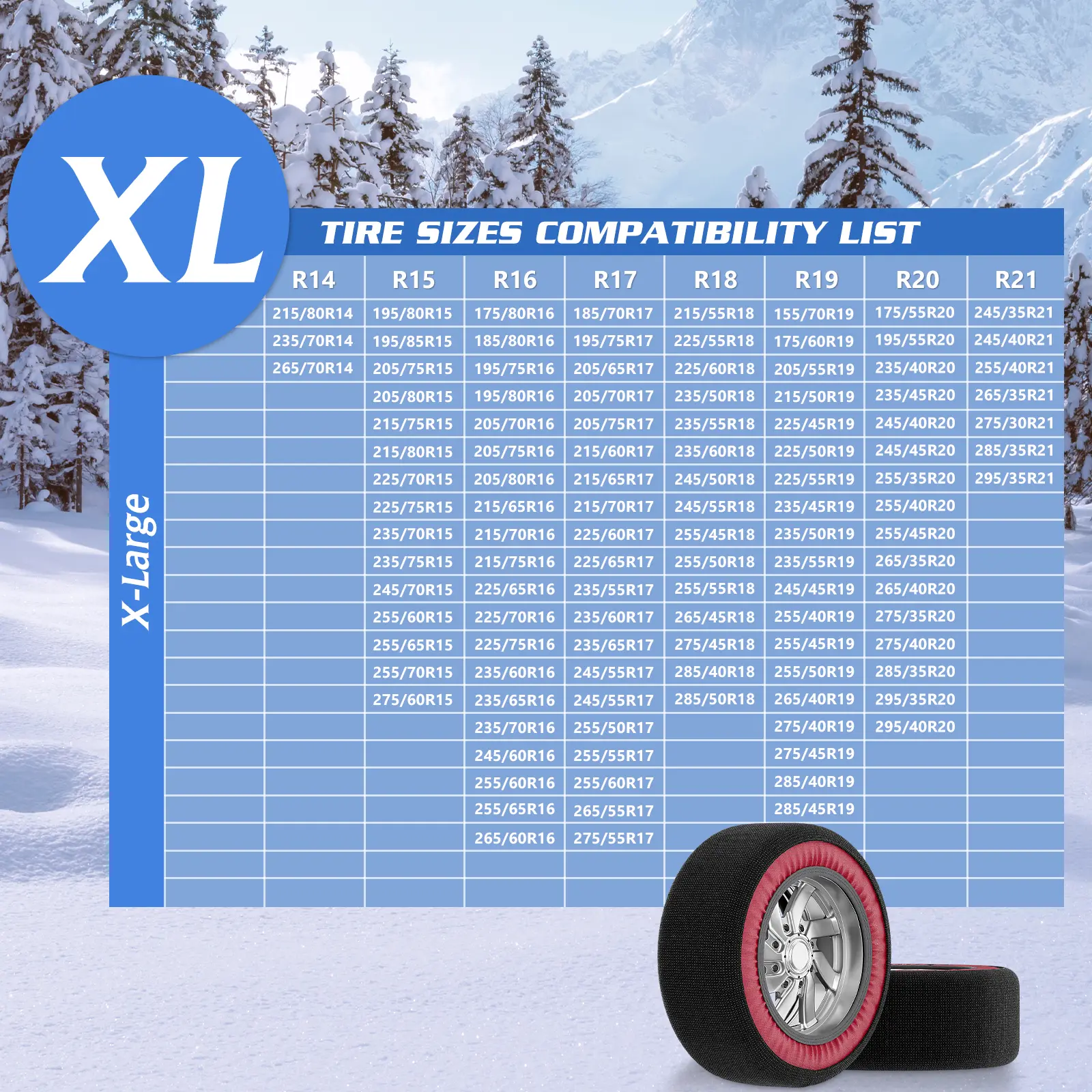 ·Multiple Sizes Available: Our tire snow socks come in M, L, and XL sizes to fit a variety of tire dimensions. Check our detailed size chart to find the perfect fit for your vehicle, ensuring optimal performance and safety