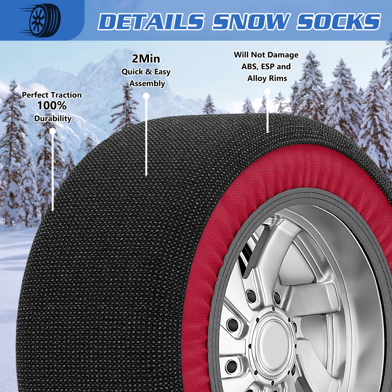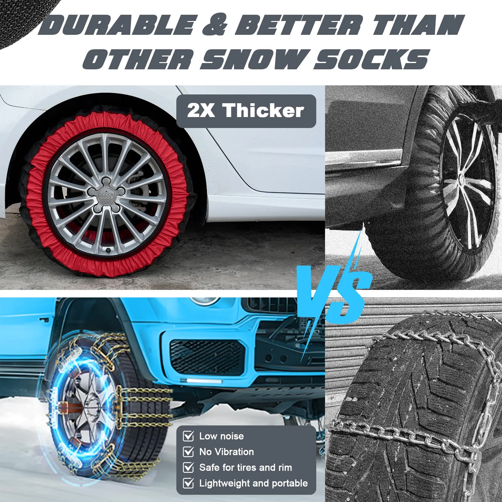 ·Perfect Alternative to Snow Chains: This set of 2 snow socks for tires can be folded up and stored in your car for a snow or ice emergency. You can enjoy a smoother driving experience, minus the bumps, noise and damage to rims associated with traditional tire chains