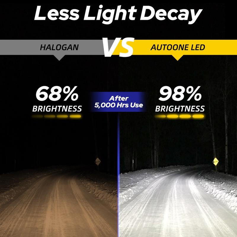 Reliable Longer Lifespan -AUTOONE led h11/h8/h9 bulbs use less power than halogen bulbs which means produce less heat. With whole aluminum body and temperature control element, the bulb will operate in a normal working temp range and produce continuous lighting without damage shortly