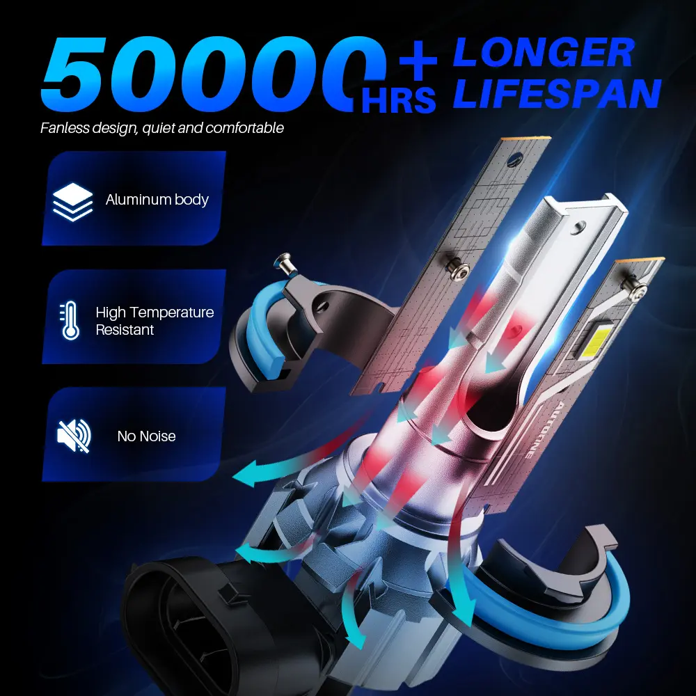Built with a durable aluminum body, high-temperature resistant and an IP67 waterproof rating, AUTOONE H8/H9/H11 bulbs are ready to perform in all weather conditions. Designed to be fanless of no noise, and last up to 50,000 hours, giving you reliable performance for the long term.