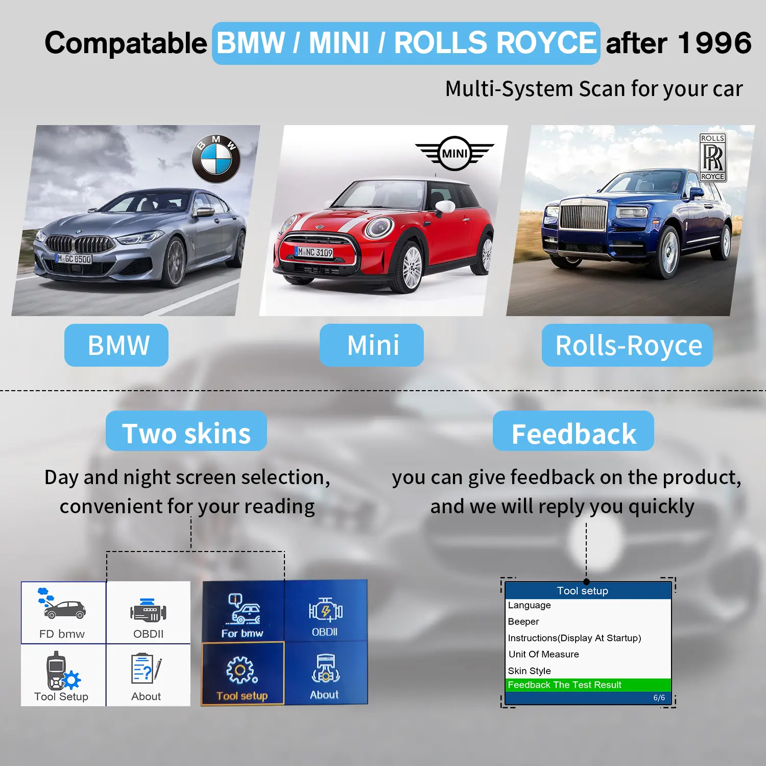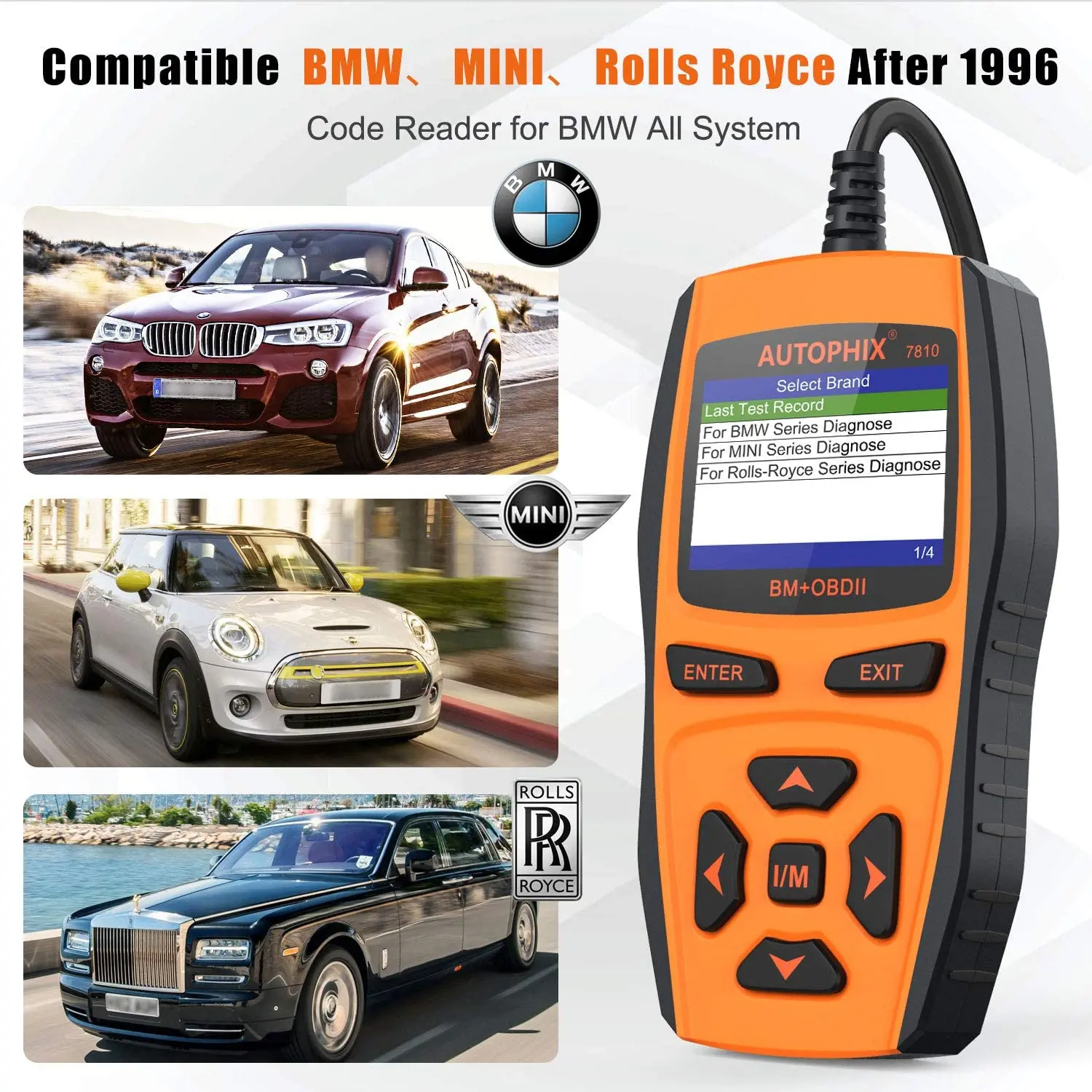 Applicable models: 7810 supports OBD 16PIN vehicles from 1998 to 2017 and later. Professional scanner, suitable for most systems of BMW Mini and Rolls-Royce vehicles, and also a universal tool for detecting engine systems of other brands of vehicles.