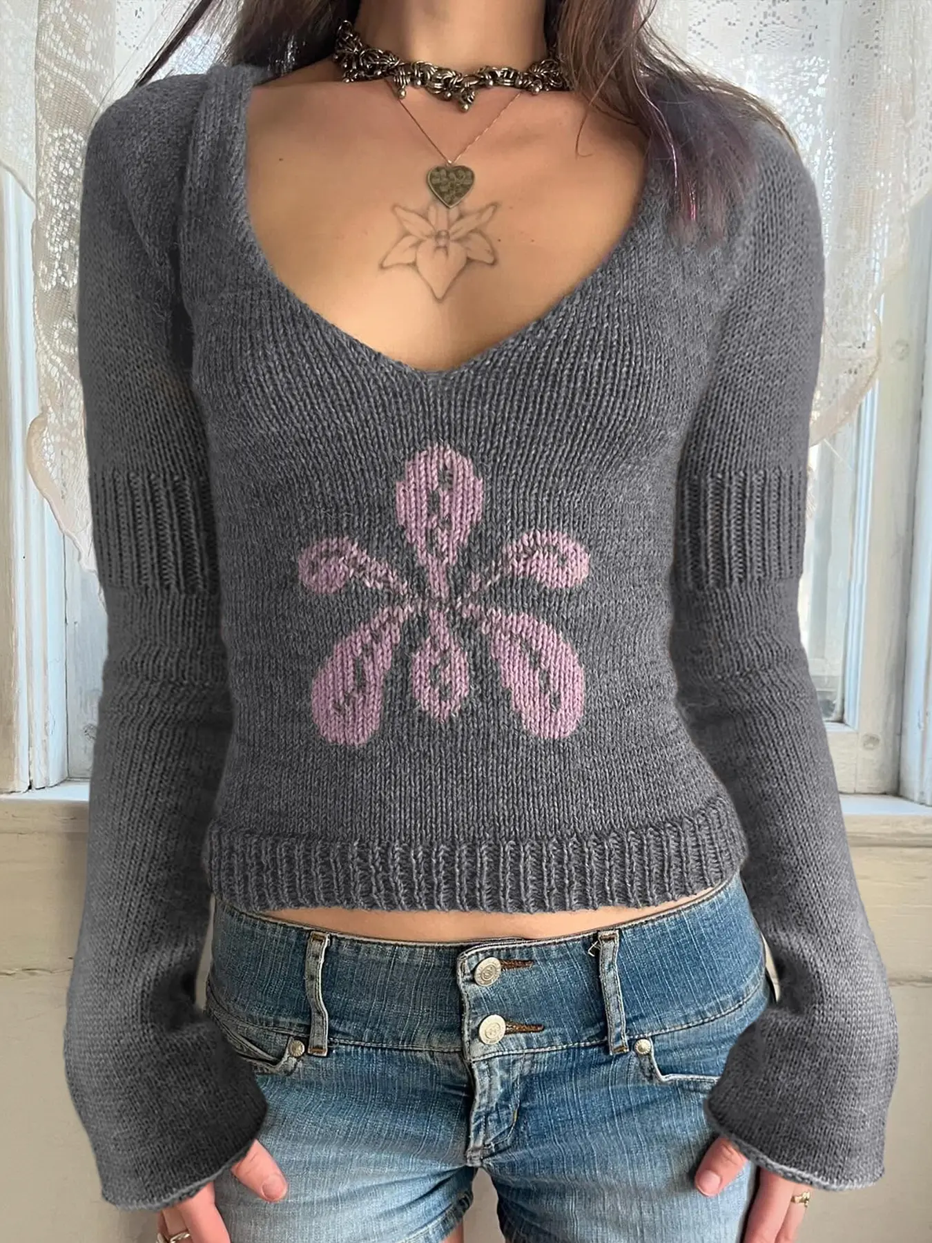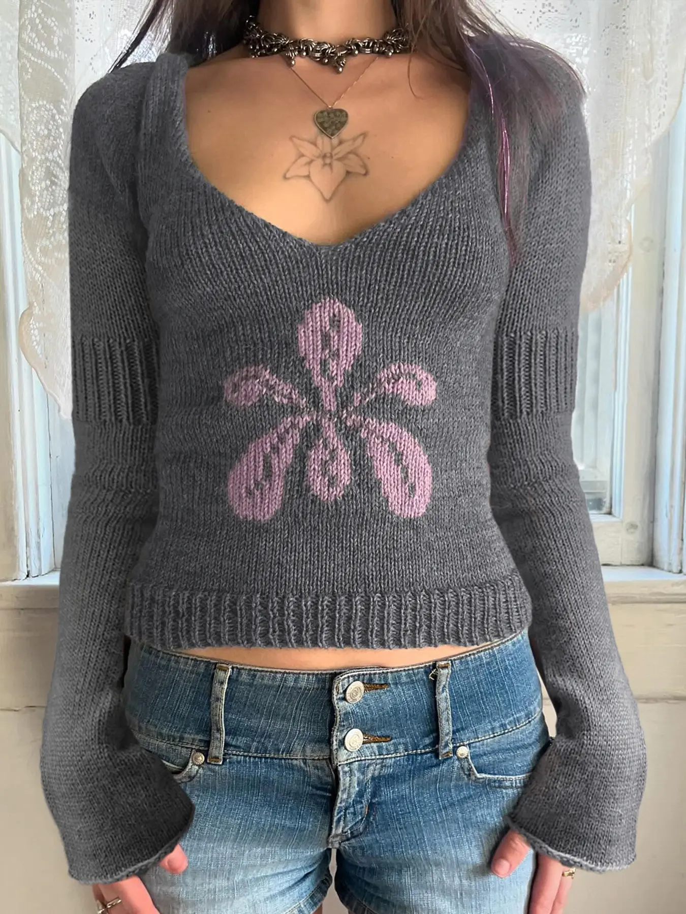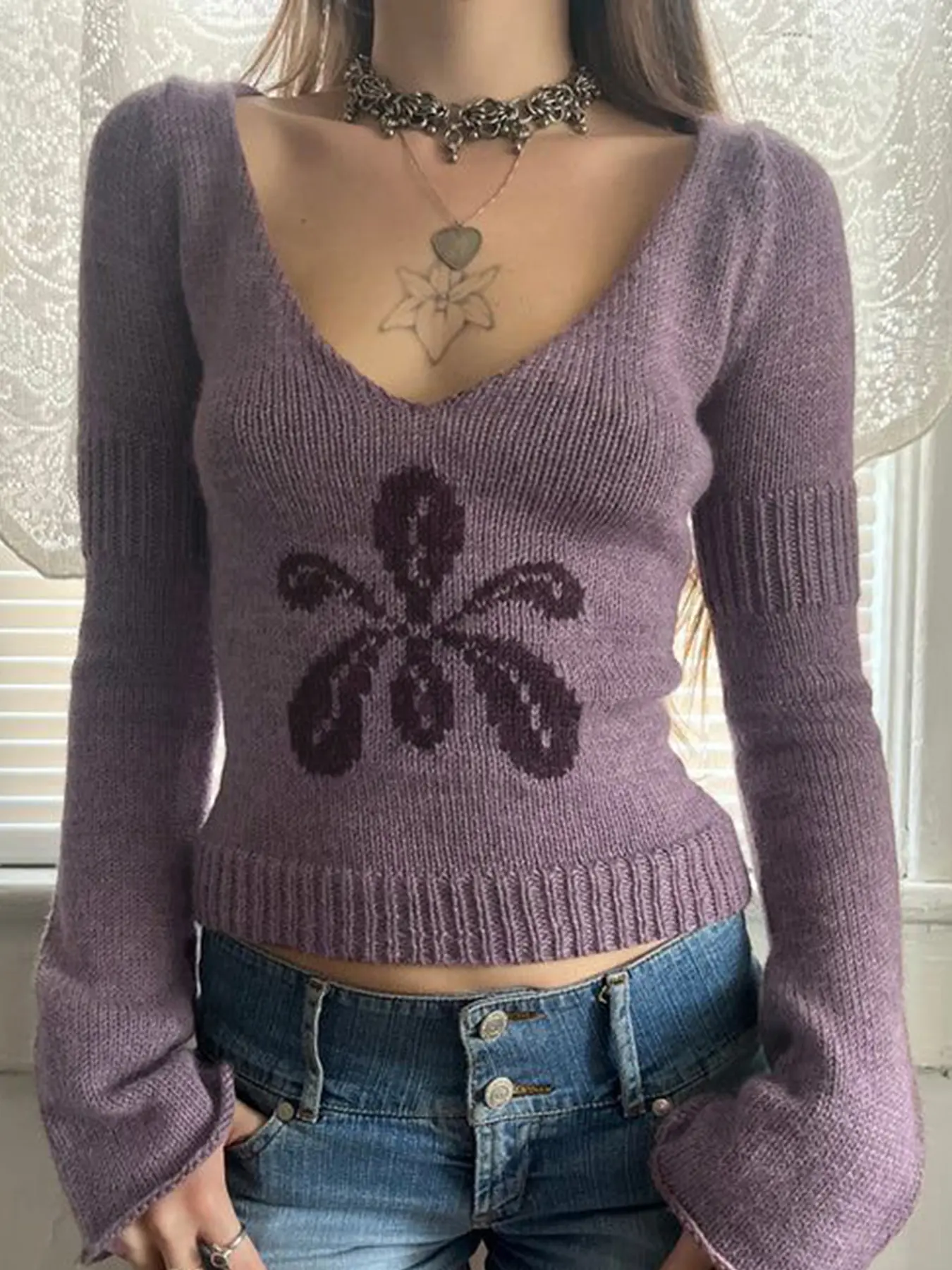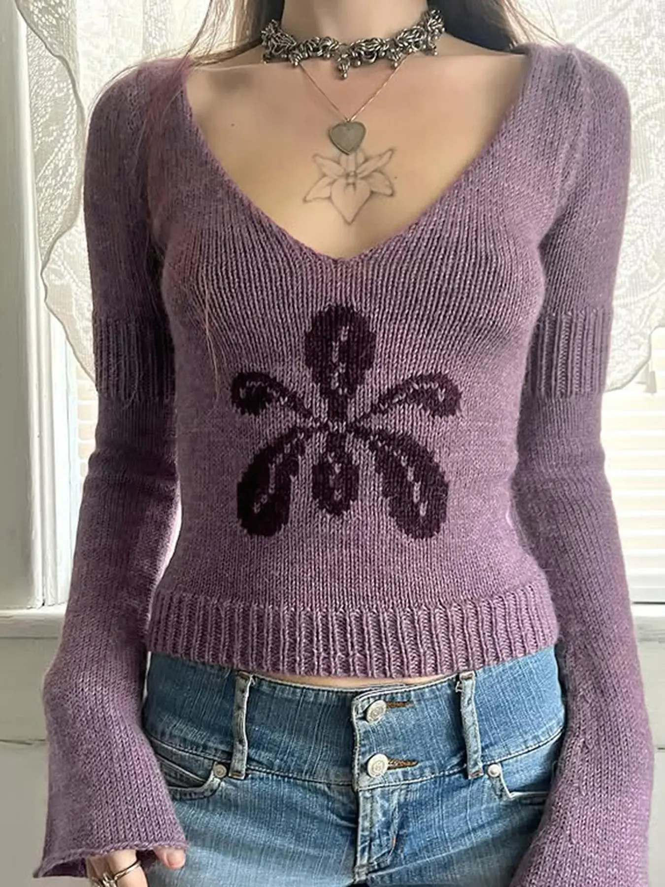 Autumn Winter New Fashion Casual Vintage Floral Jacquard Knitting Slim Fit Long Sleeve Sweater V Neck Y2K Aesthetic Pullover Knitwear Womenswear