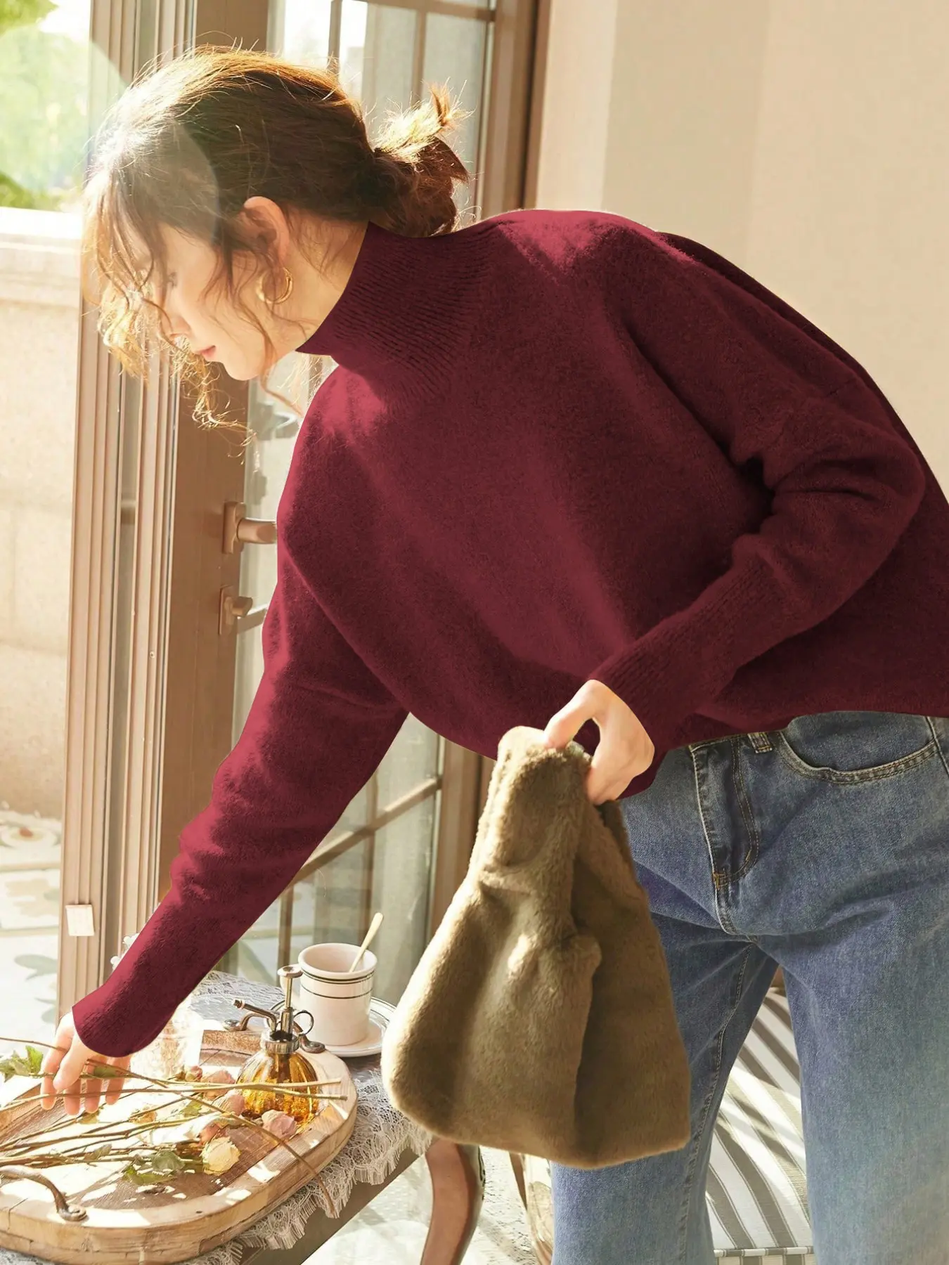 Love this turtleneck sweater! Soft, very lightweight, great stretch, comfortable and great quality. I sized up to a Medium for a relaxed fit. I’m 130 lbs and it fits perfectly 👌