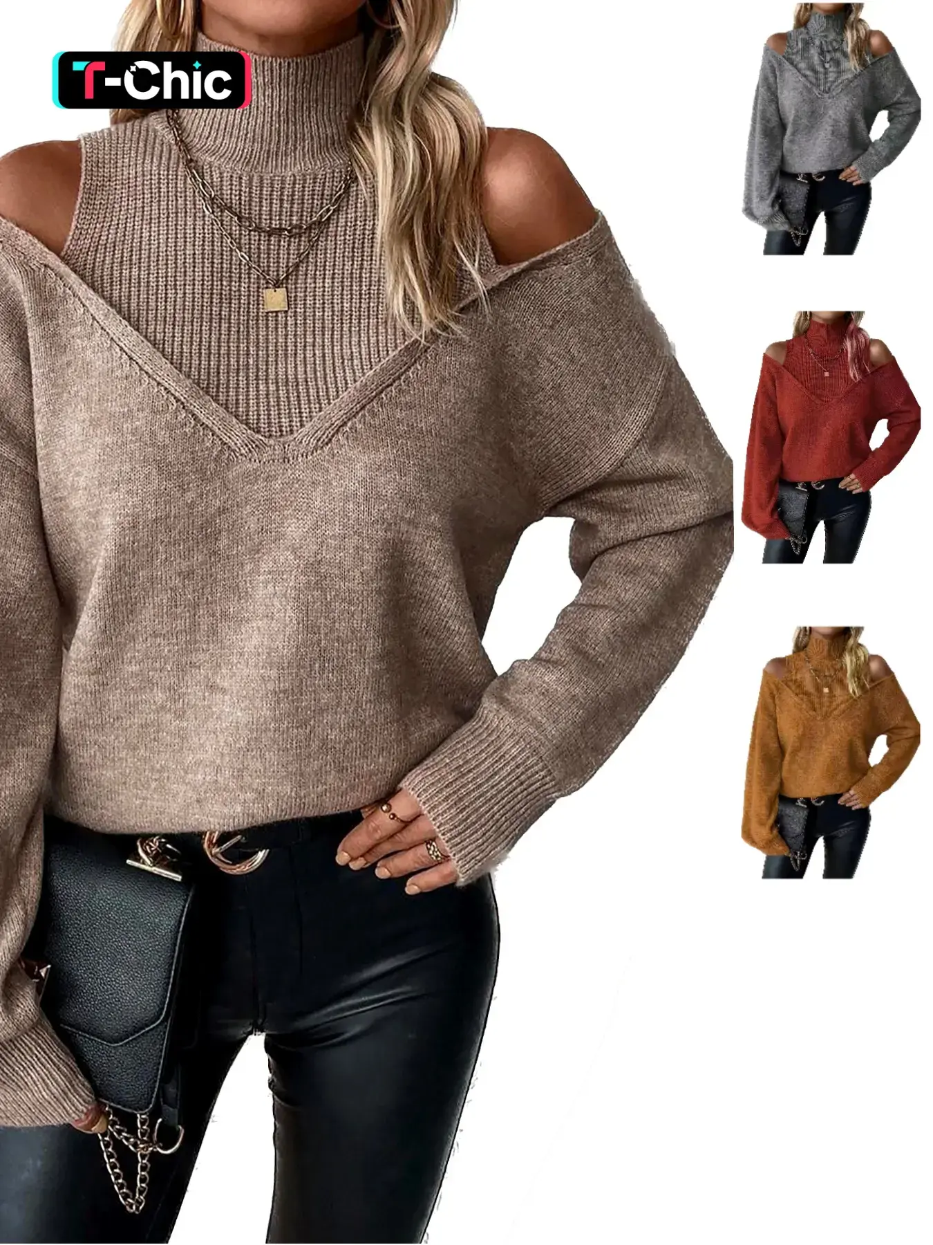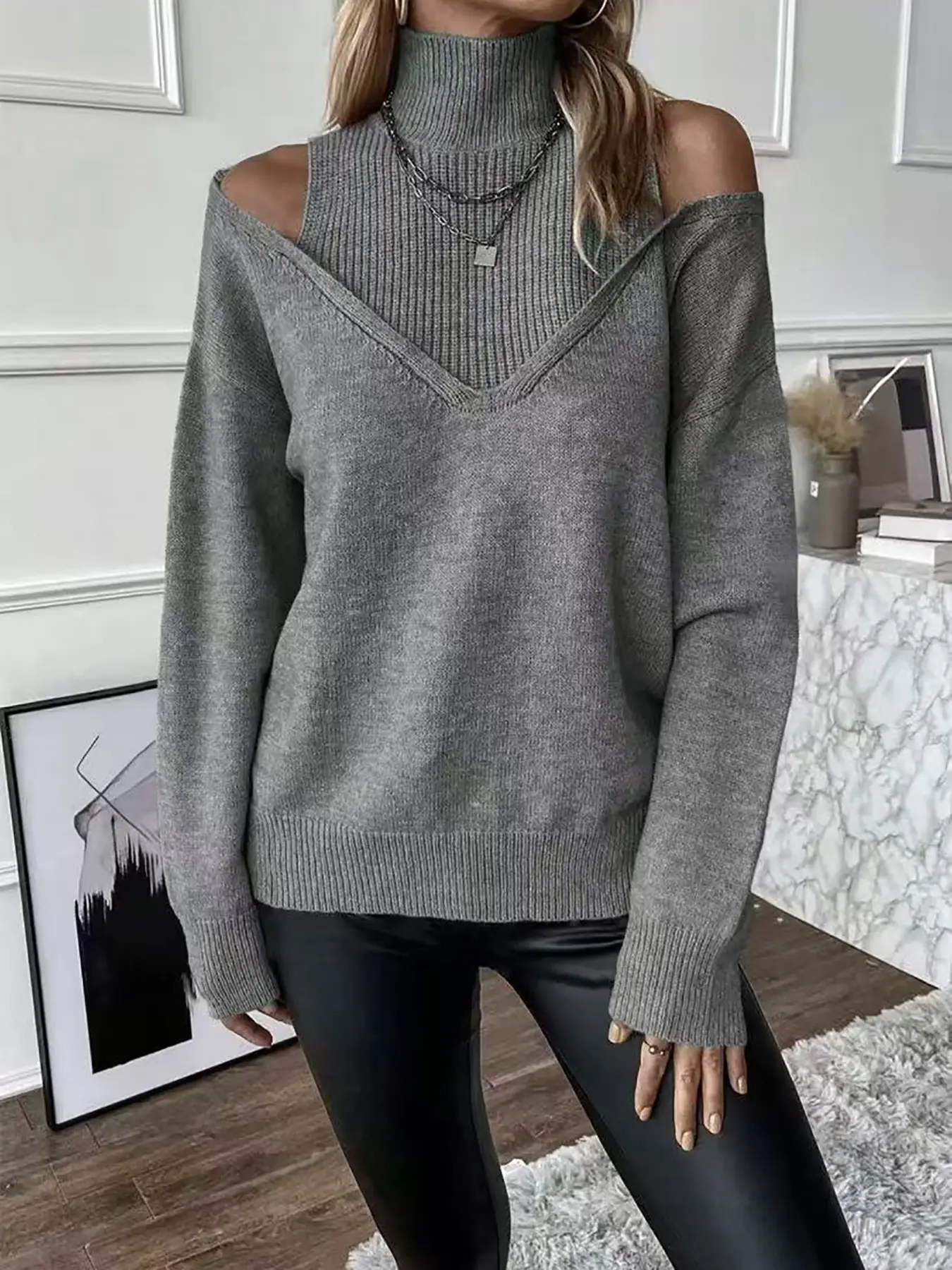 Autumn Winter New Pure Color Loose Simple Fashion Knit Off-Shoulder Long Sleeve High Neck Sweater, Soft Comfortable Elegant Casual Top #TikTokShopBlackFriday #TikTokShopCyberMonday #spotlightfinds #ootd/  #clothing