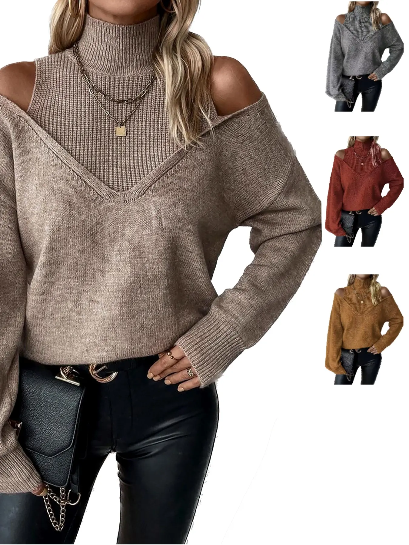 5. Autumn Winter New Pure Color Loose Simple Fashion Knit Off-Shoulder Long Sleeve High Neck Sweater, Soft Comfortable Elegant Casual Top Womenswear