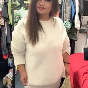 Pretty in pink , design and material is comfortable has stretch it’s a soft light sweater set got it a size up because they didn’t have XL but still a lovely sweater set ☺️ to wear