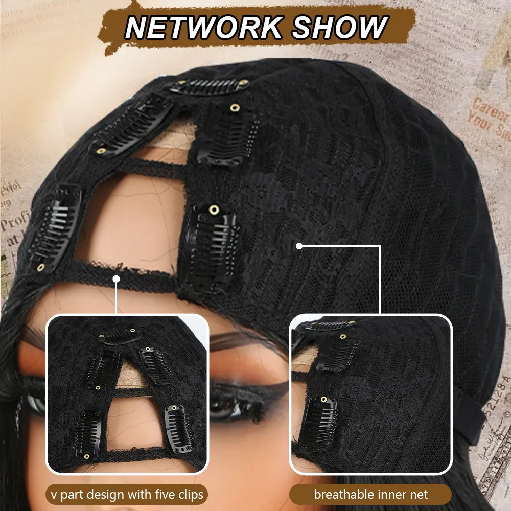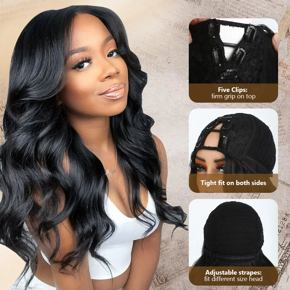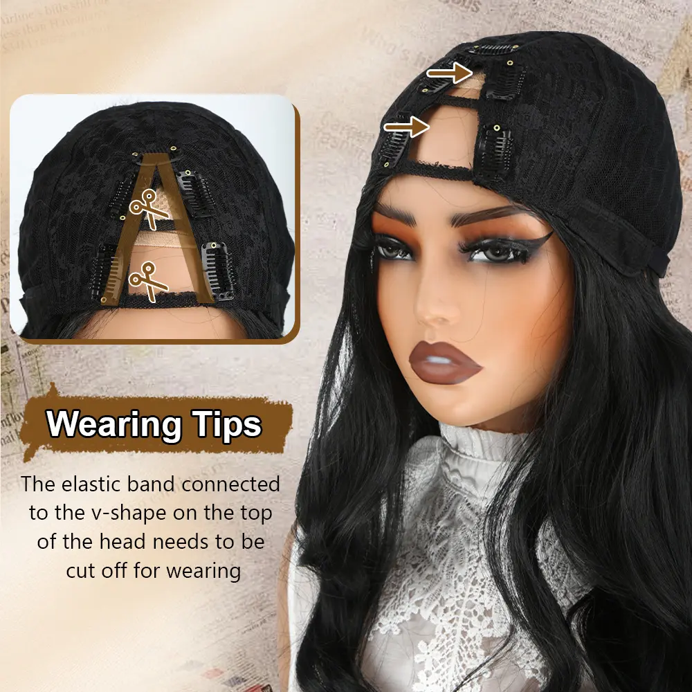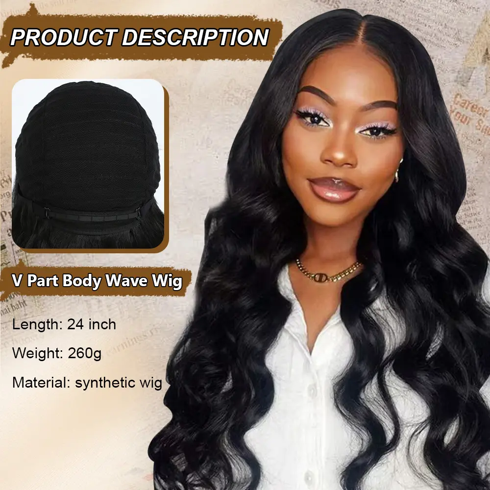 AuvzyHair 24inch V Part Wig offers a body wave, glueless clip-in extension. It features a thin part and long wavy black half wig. Perfect for women, this synthetic hair wig is beginner-friendly. It shows your real scalp and natural hairline, providing a rest for your scalp while offering great hairstyles.