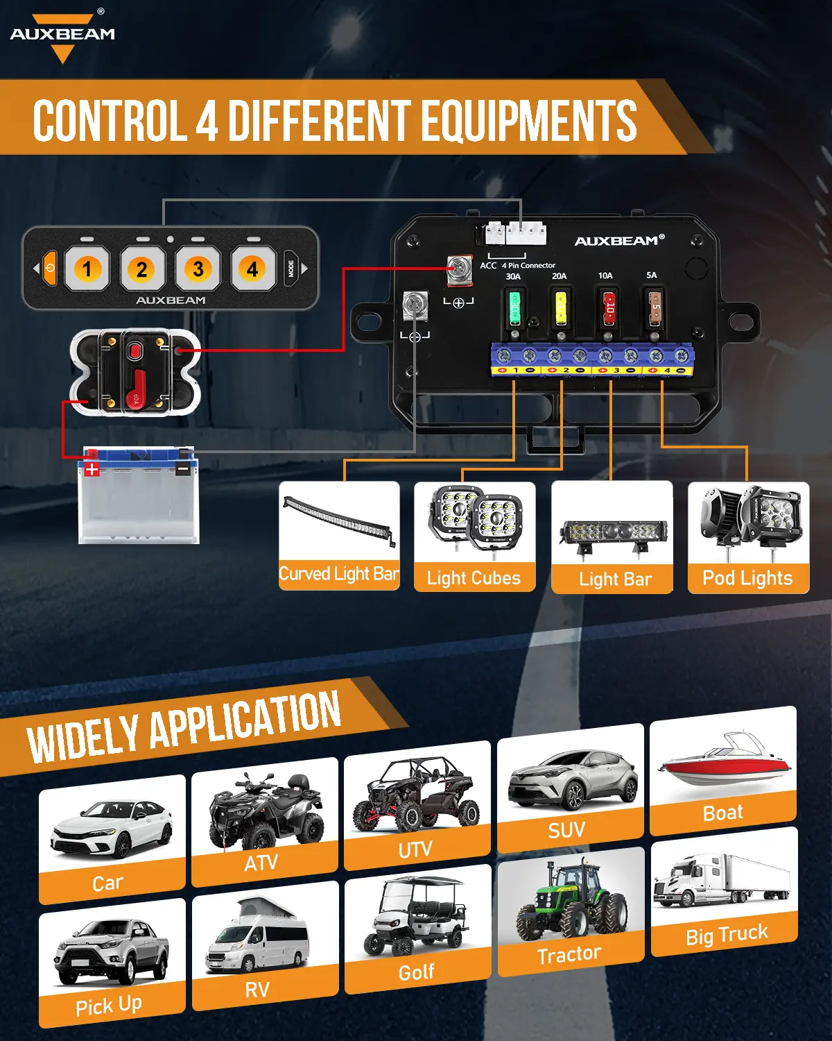 Auxbeam AS Series 4 Gang Slim Switch Panel | AS-R40 Car Switch Control