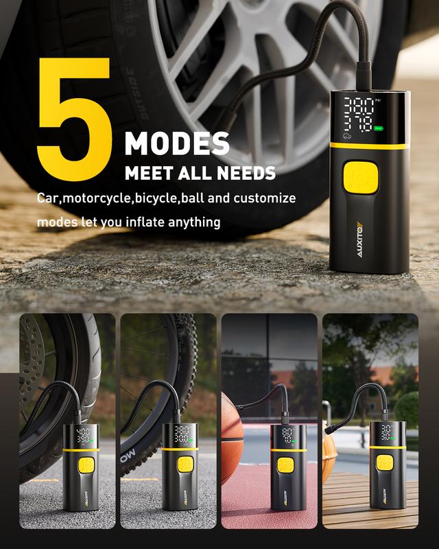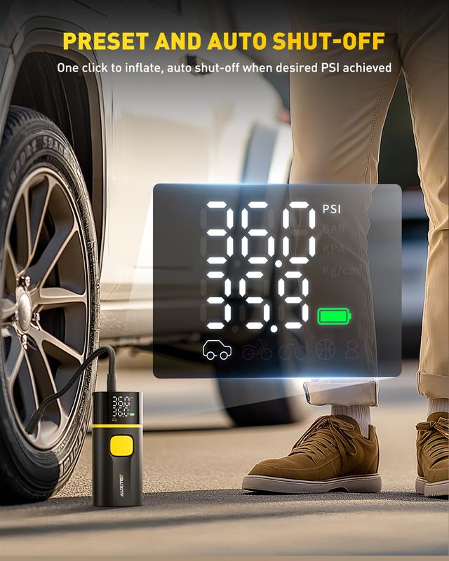 ·Pre-set & Auto Shutoff : AUXITO digital air compressor provide precise pressure readings on the large LCD display which can be used as tire pressure gauge, allow users to set the desired PSI before inflation, and automatically stops when the set pressure is achieved. Supre easy to use. No worry about over inflation.