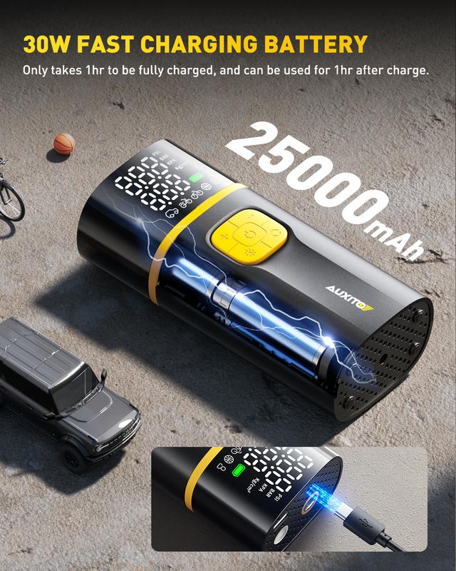 ·30W Fast Charging: With a PD 30W quick recharge design, A502 battery powered tire inflator can reach full charge in just 1 hour (others with no fast charging will need nearly 4 hrs to charge), allowing you to get back to the cordless tire inflation sooner without long time waiting. Convenient to inflate cars, SUVs, motorcycles, bikes and balls.