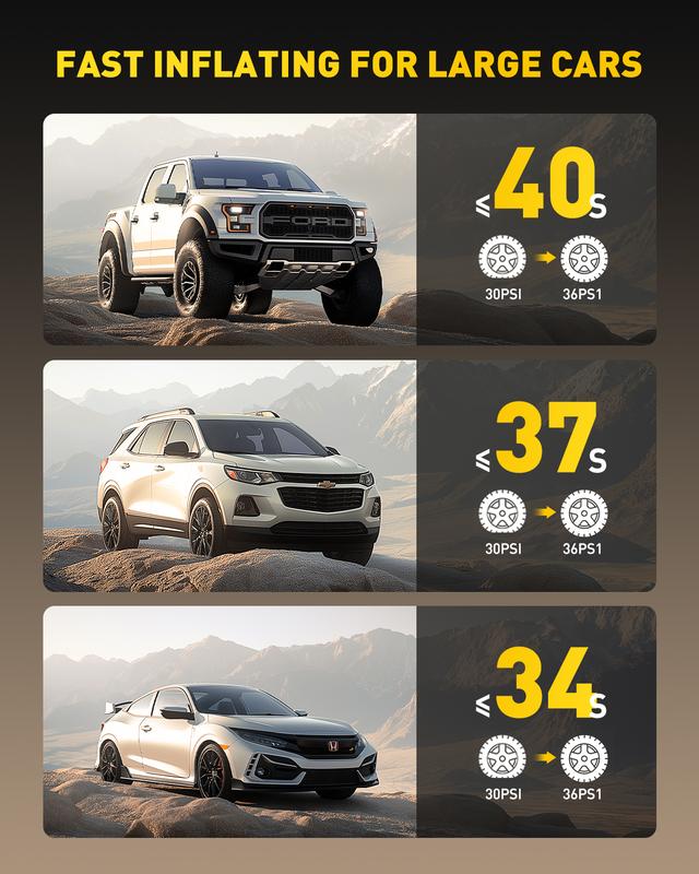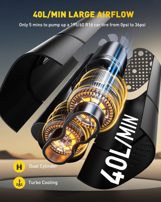 ·40S Fast Inflation: Compared to others’ 14mm single air cylinder, AUXITO car tire air pump portable equipped with upgraded 19mm double air cylinder and 100w powerful motor which can produce 40L/MIN airflow, pump up a standard car tire from 0psi to 36psi in just 5 minutes, 40s to add air from 25psi to 36psi. Saving you valuable time when you're on the go, no more waiting around at gas stations.