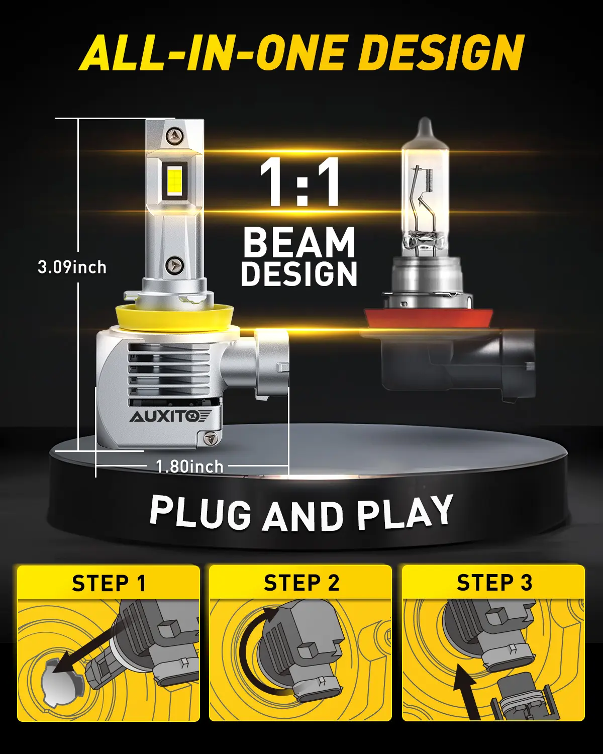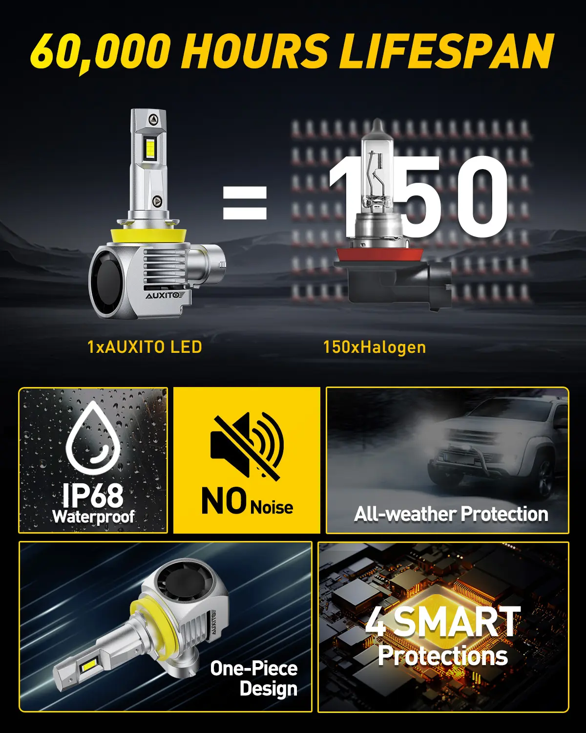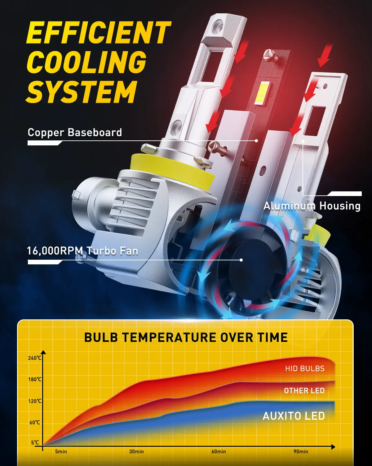 ·【Longevity Beyond 60,000 Hours】Wave goodbye to overheating woes. The AUXITO bulbs feature a full aluminum body, a high-speed cooling fan, and a copper base board. This synergistic combination effectively curtails overheating, prolonging the bulb's lifespan to over 60,000 hours. This means consistent and reliable brightness without the risk of premature burnout.