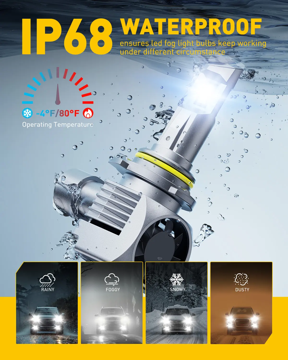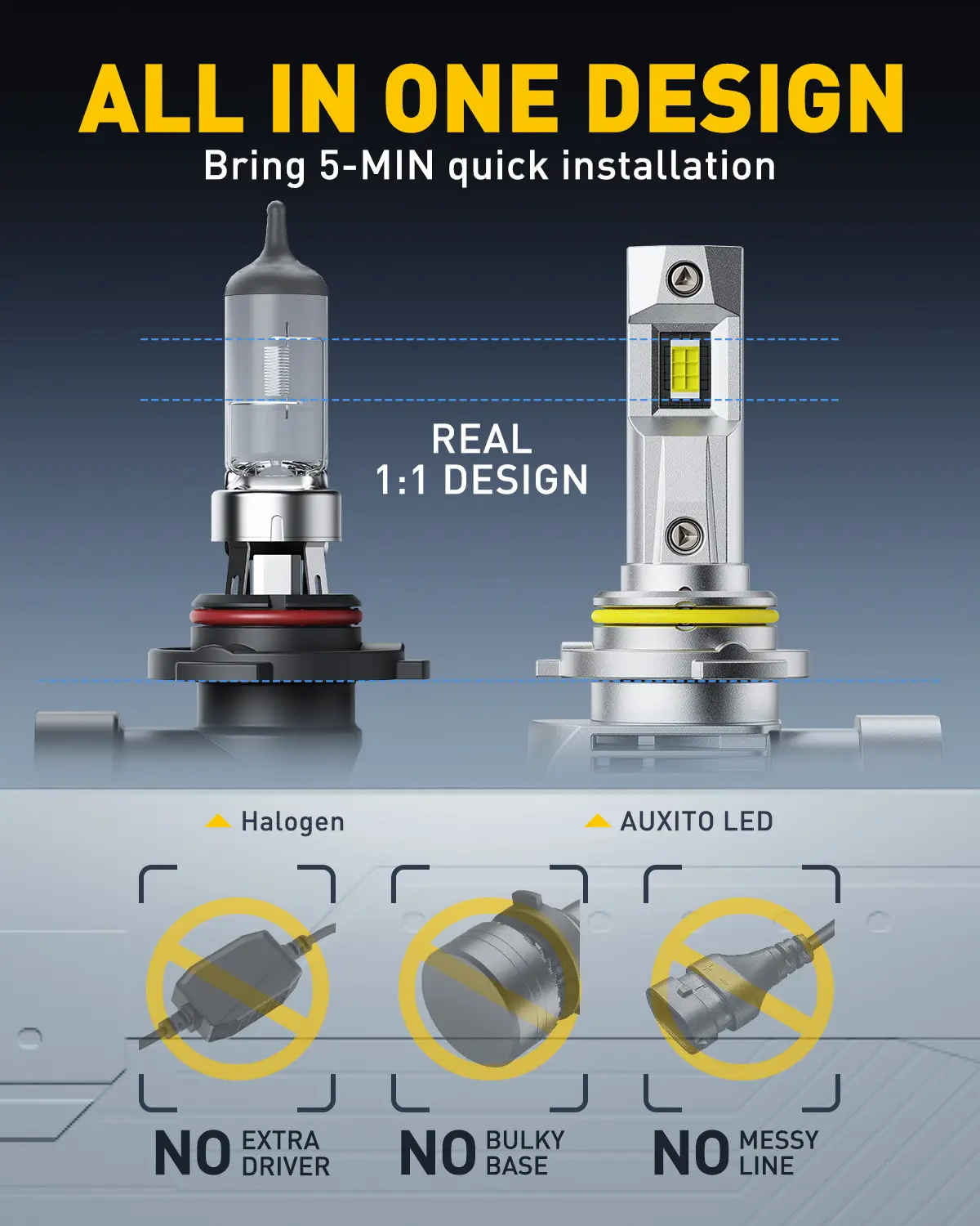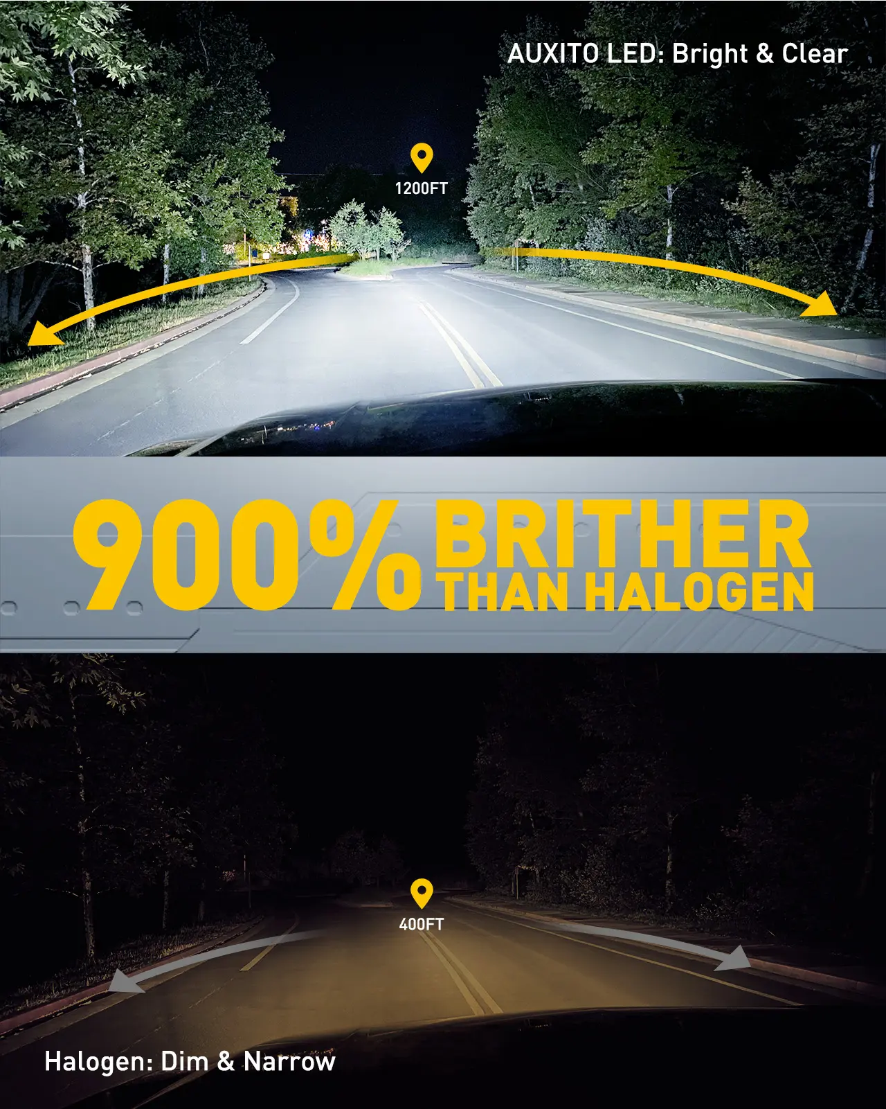 ·【9 Times Brighter Illumination】AUXITO LED Headlight, equipped with advanced CSP chips, achieve an astonishing 900% (9 times) increase in brightness over traditional halogen bulbs. This significant boost in luminosity not only expands your field of vision but also enhances driving safety during night-time excursions and alleviates eye fatigue.
