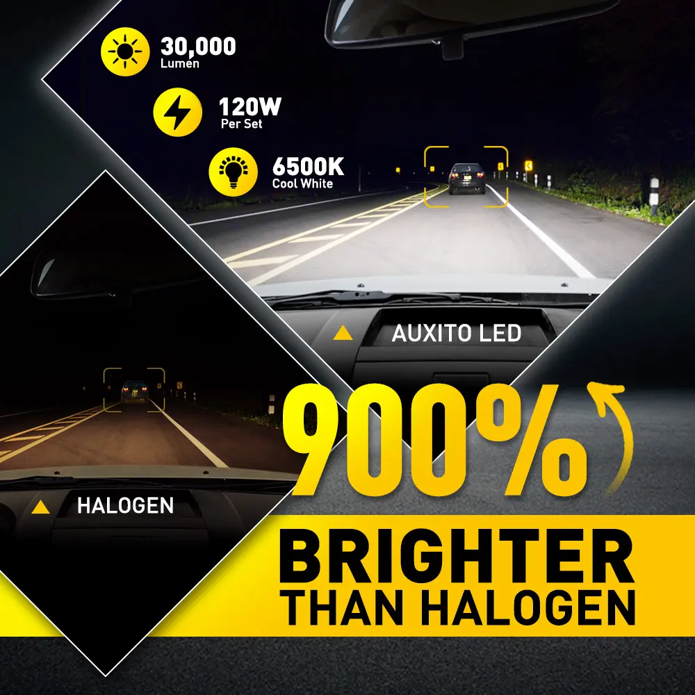 ·【9 Times Brighter Illumination】AUXITO LED Headlight, equipped with advanced CSP chips, achieve an astonishing 900% (9 times) increase in brightness over traditional halogen bulbs. This significant boost in luminosity not only expands your field of vision but also enhances driving safety during night-time excursions and alleviates eye fatigue