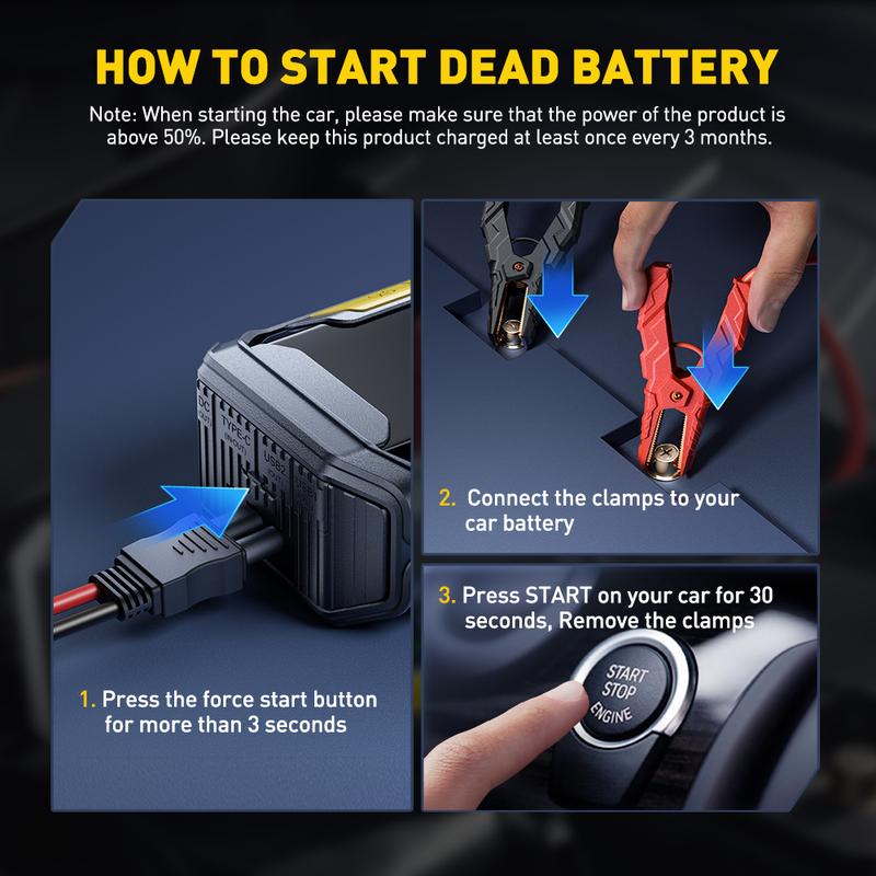 ·Boost Function for Low Battery: When your car battery is below 9V, engage the boost function by pressing and holding the "boost" button for 5 seconds while in start mode. The "READY" light turns green, enabling you to start your car. Safety is our top priority with 10 protective features, including anti-short-circuit technology. Please avoid cable reversal during boost mode