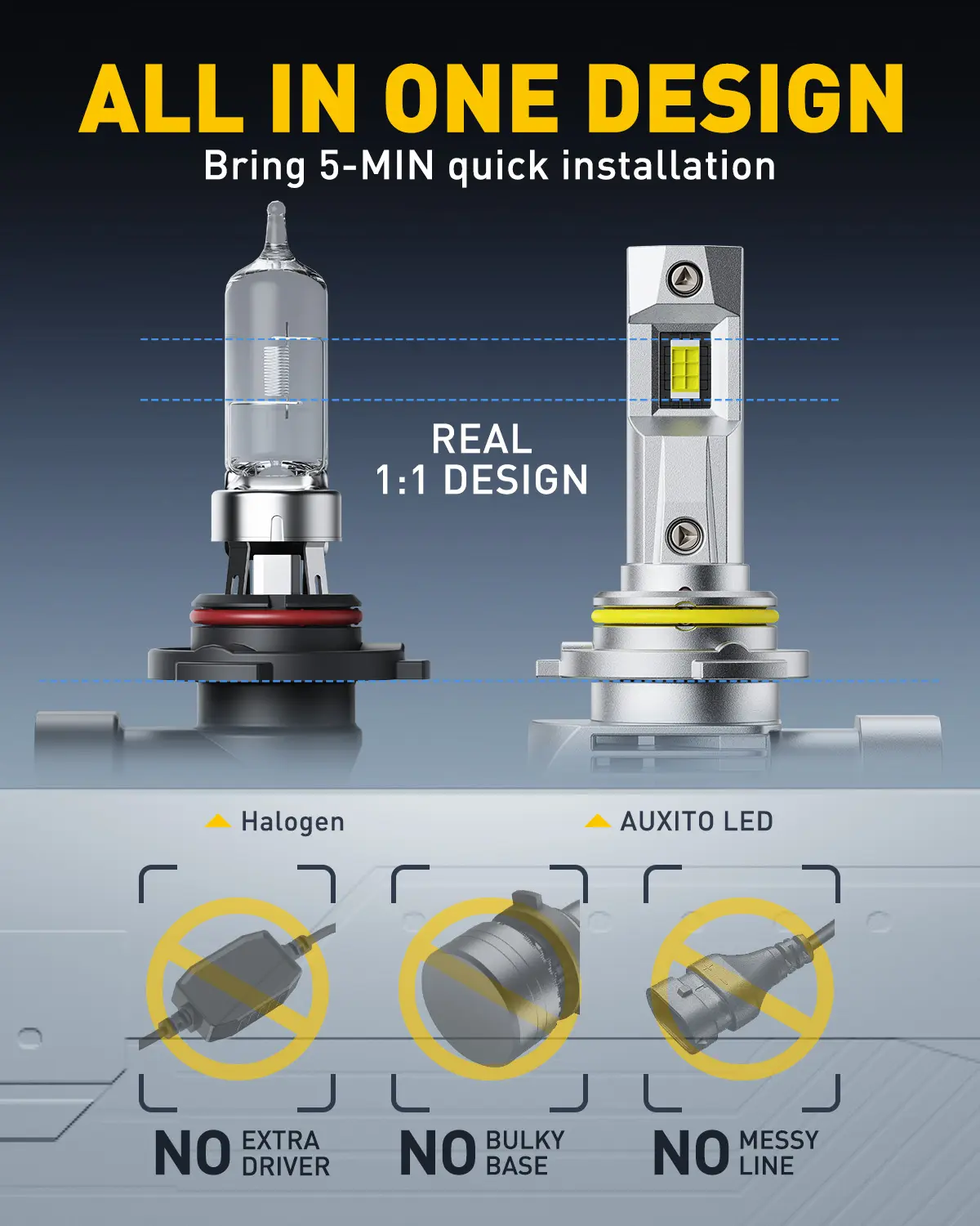 ·【9 Times Brighter Illumination】AUXITO LED Headlight, equipped with advanced CSP chips, achieve an astonishing 900% (9 times) increase in brightness over traditional halogen bulbs. This significant boost in luminosity not only expands your field of vision but also enhances driving safety during night-time excursions and alleviates eye fatigue.