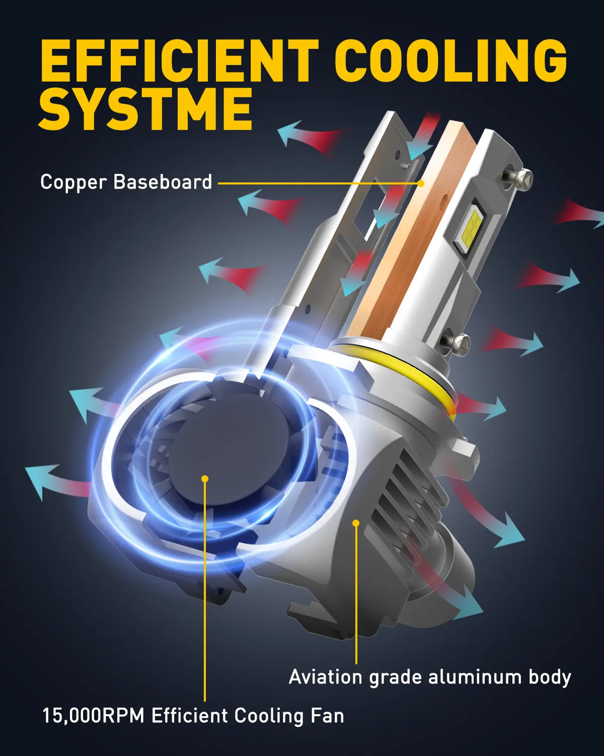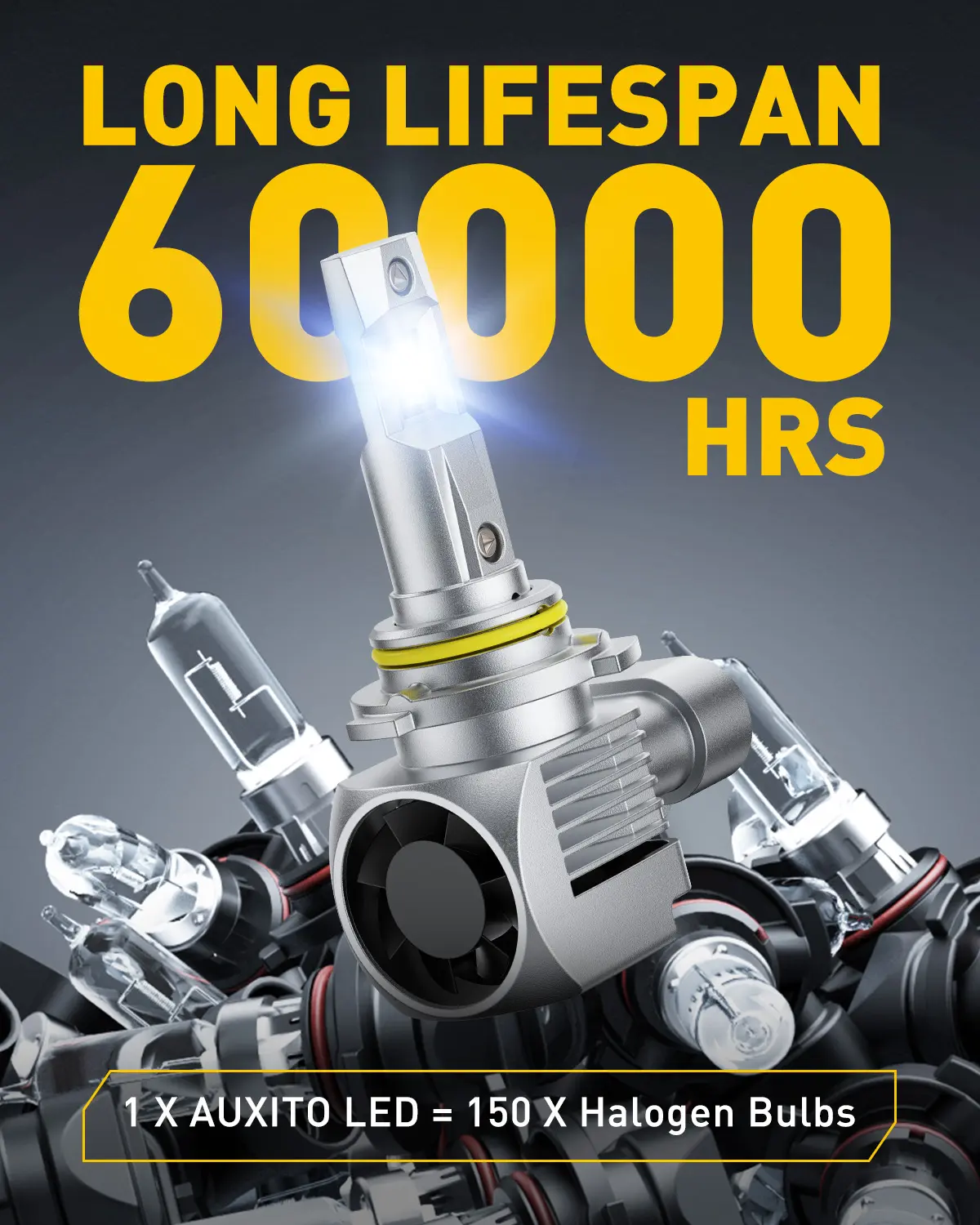 ·【Longevity Beyond 60,000 Hours】Wave goodbye to overheating woes. The AUXITO bulbs feature a full aluminum body, a high-speed cooling fan, and a copper base board. This synergistic combination effectively curtails overheating, prolonging the bulb's lifespan to over 60,000 hours. This means consistent and reliable brightness without the risk of premature burnout.