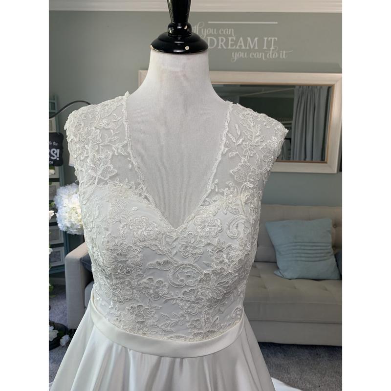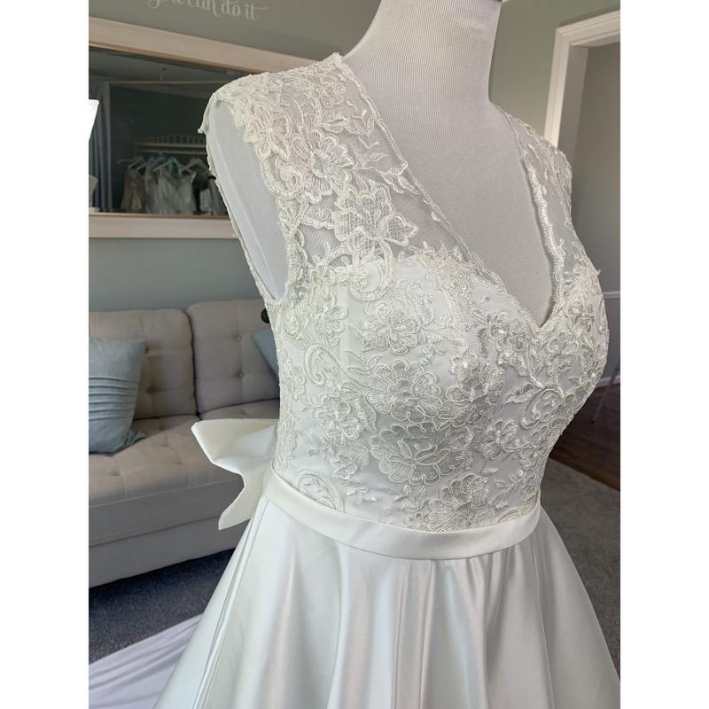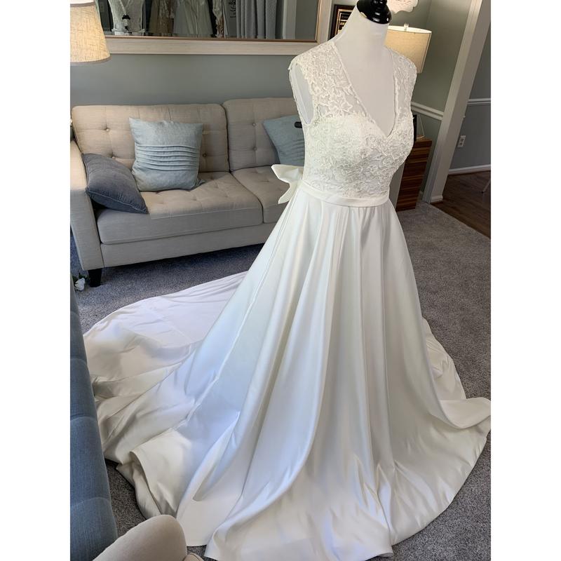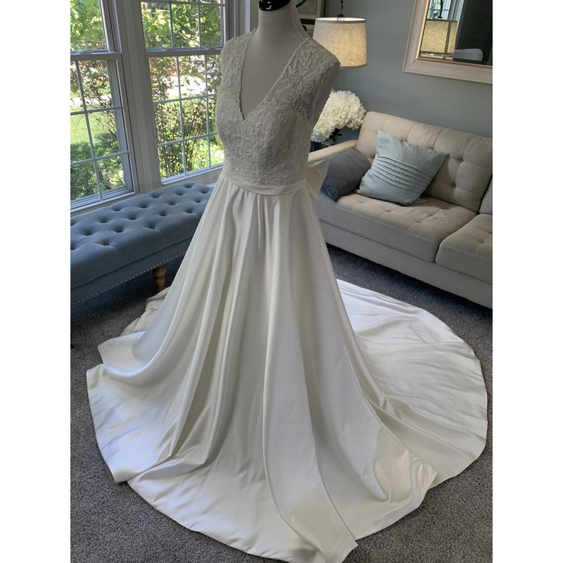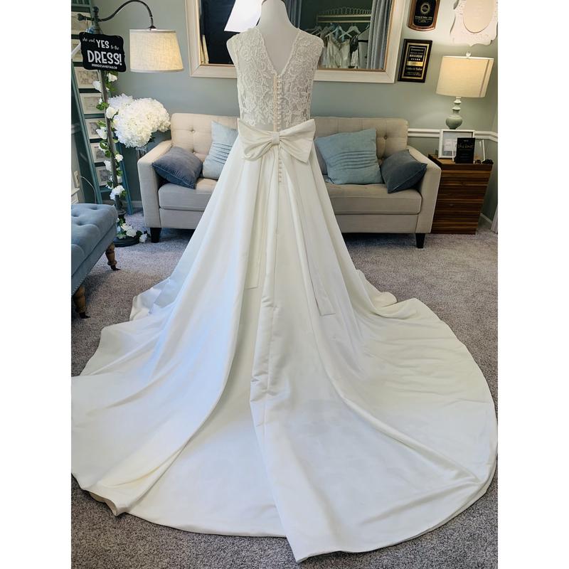 This gorgeous Duchess Satin Wedding Dress with a bow at the back is the perfect simple yet elegant Wedding Dress. It features a gorgeous illusion back wedding dress with lace, a removable bow that can be inserted/removed easily, and gorgeous comfortable material that flows beautifully. It can be custom made in any size!