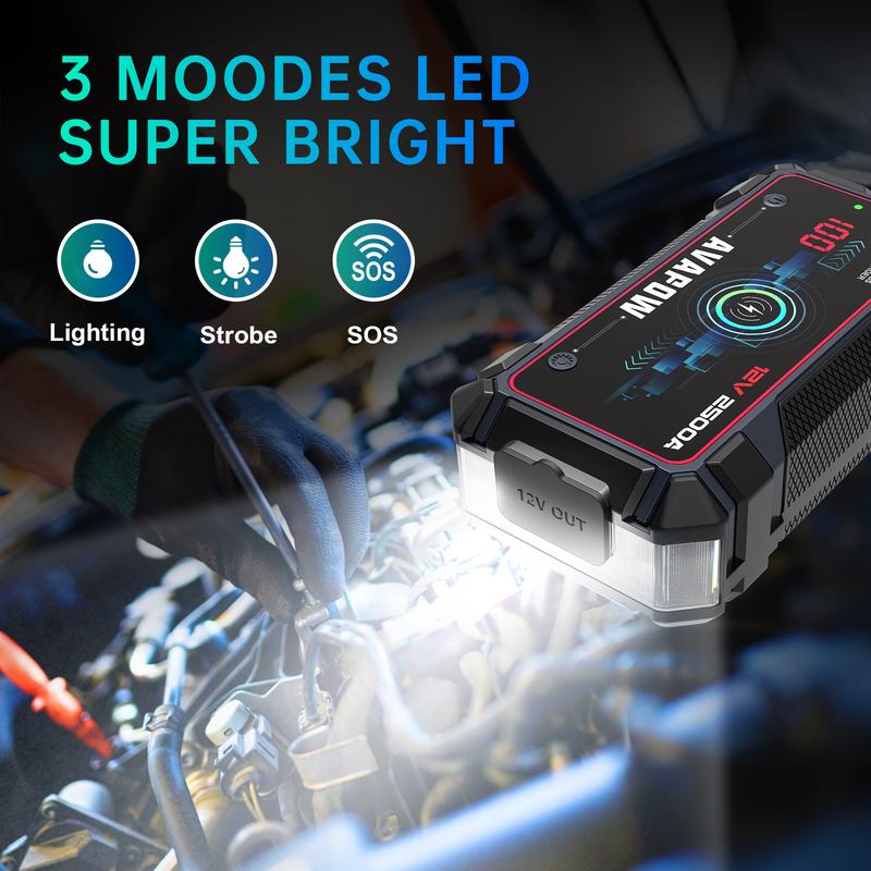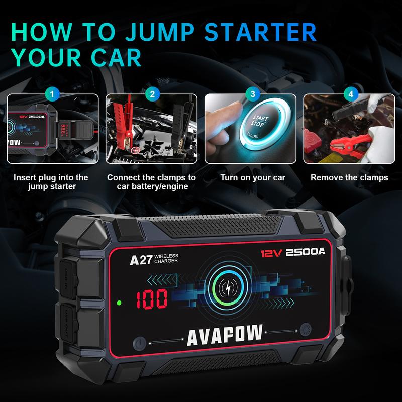 ·START YOUR CAR BATTERY WITH AVAPOW A27 JUMP STARTER - This powerful and safe jump starter can start your car battery with ease. With 2500A peak currents, it is perfect for vehicles up to 8.0L gas or 8.0L diesel engines. You can enjoy up to 45 jump starts on a single charge.