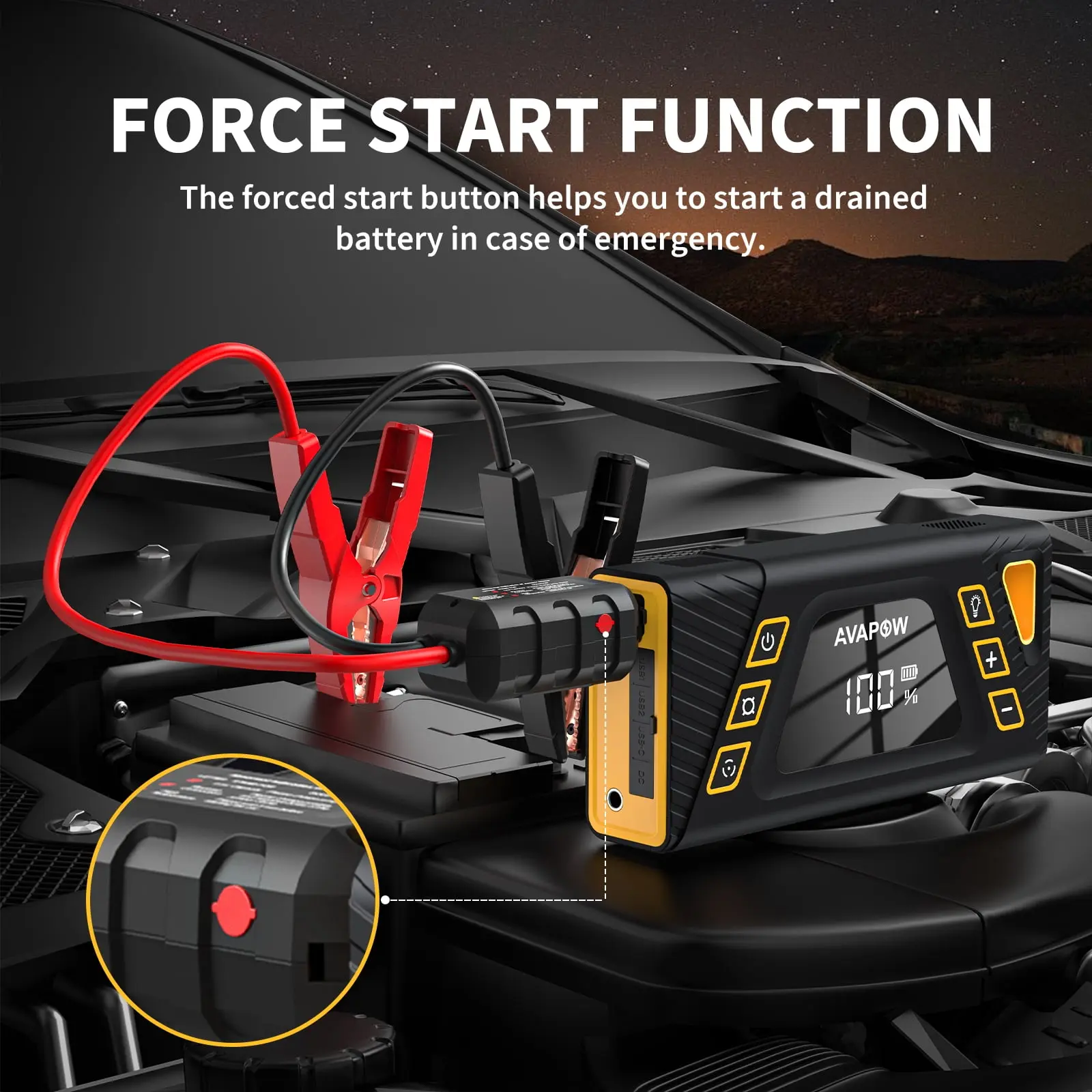 ·FORCE START FUNCTION - Our portable car jump starter's clamps are equipped with a force start button design. If the vehicle is unable to start, hold and press the force button for 3 seconds until the green light illuminates before starting the car. Built-in 10 protections against misuse, meeting national standard UL & FCC Certifications.PACKAGE INFORMATION:1 X WP8S Jump Starter with Air Compressor1 X Heavy-Duty Jumper Cables4 X Valve Adapters1 X USB-C Charging Cable1 X USB-A Charging Cable1 X DC Cigarette Lighter Adapter1 X Air Hose1 X User Manual1 X Zipper Carrying Case