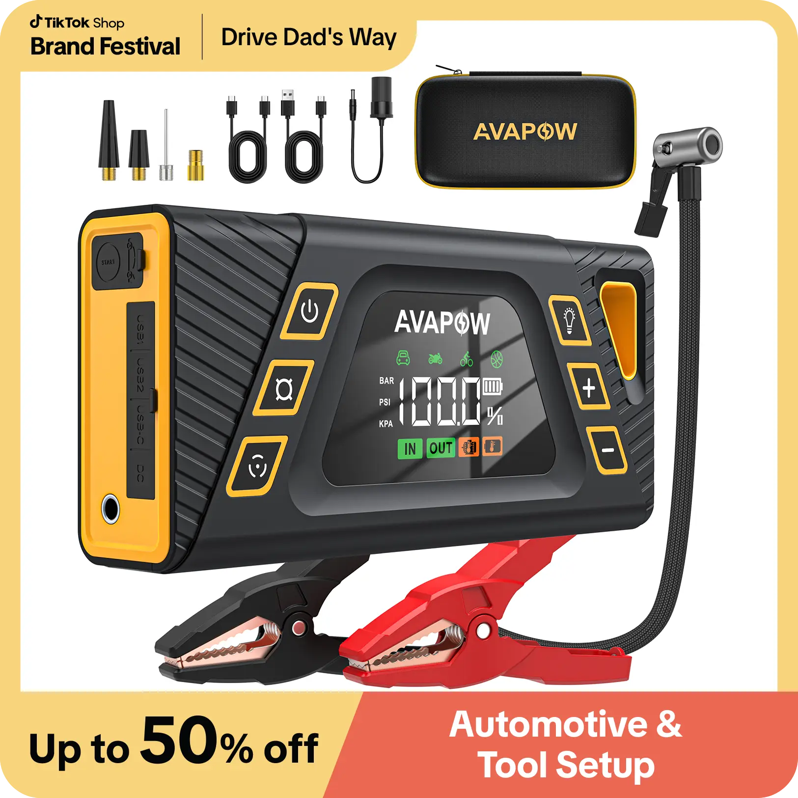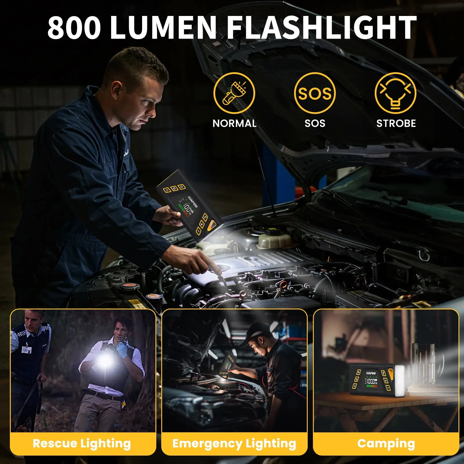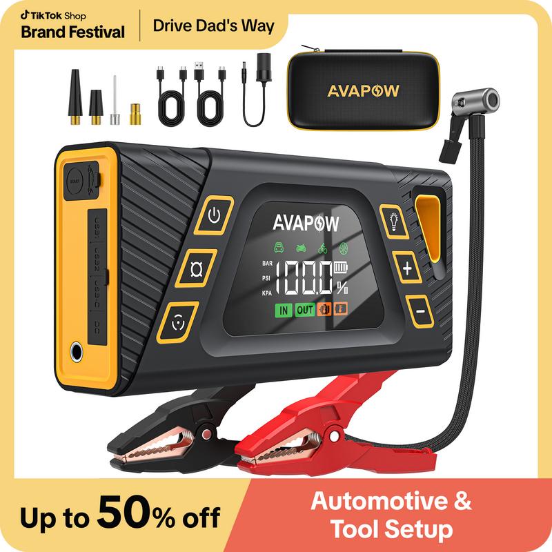 ·6-IN-1 PORTABLE JUMP STARTER - The AVAPOW battery jump starter is compact and portable with 6 practical functions to meet all your needs, including car emergency jump start, air compressor, 800-LUMEN LED light with 3 modes (flashlight, SOS warning, strobe), tire pressure gauge, and a power bank (equipped with 3 ports: PD 30W Type-C IN/OUT and 2 USB output ports).