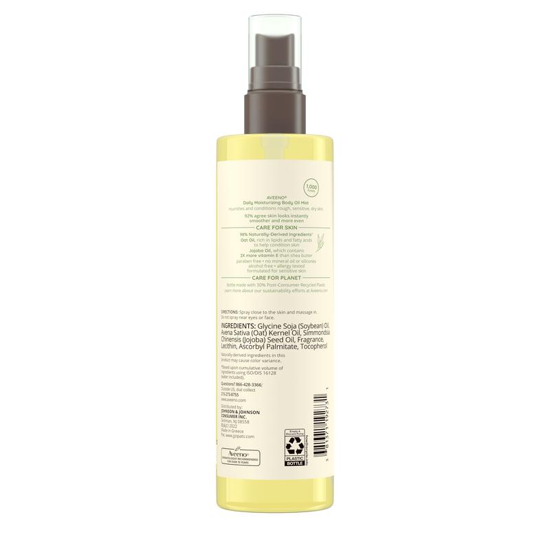 Condition and nourish your skin with Aveeno Daily Moisturizing Body Oil Mist. Ideal for sensitive skin care, this body oil spray immediately moisturizes rough, dry skin; 92% of testers agree skin instantly looks smoother even after application. From a dermatologist-recommended skincare brand for over 70 years, this daily moisturizing body oil is formulated with 98% naturally derived ingredients including oat oil, which is rich in lipids and fatty acids to help condition skin, and jojoba oil, which contains twice as much vitamin E as shea butter. This moisturizing body oil spray is allergy tested, formulated for sensitive skin and free of parabens, silicones, mineral oil, and drying alcohol. Use daily as part of your regular at-home skincare routine by spraying the oil mist close to your skin and massaging it in. Do not spray the oil near eyes or face. Aveeno's eco-friendly bottle is made with 30% Post-Consumer Recycled Plastic.