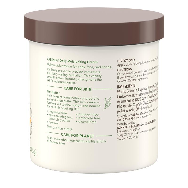 Moisturize your sensitive, dry skin on your body, hands, and face with Aveeno Daily Moisturizing Cream with prebiotic oat and shea butter. Designed for normal to dry, sensitive skin, this moisturizer from Aveeno, a dermatologist-recommended skincare brand for over 70 years, instantly strengthens skin's moisture barrier and hydrates for 48 hours. The velvety cream is clinically proven to provide immediate and long lasting hydration. Suitable for sensitive, dry skin. Leaves skin soft, soothed, nourished and healthier-looking. Ideal for sensitive skin, the body and face cream is formulated with an indulgent combination of prebiotic oat and shea butter. It's also free of fragrances, dyes, parabens, phthalates, and alcohol and is non-comedogenic, so it won't clog your pores. For best results, apply the daily moisturizing cream to body, face, and hands as part of your regular skincare routine.