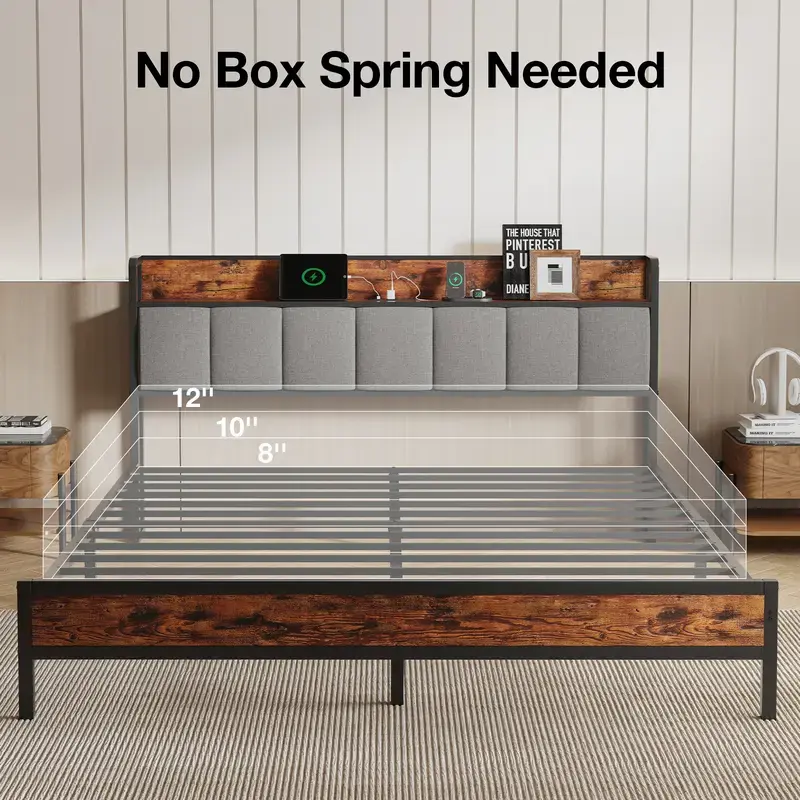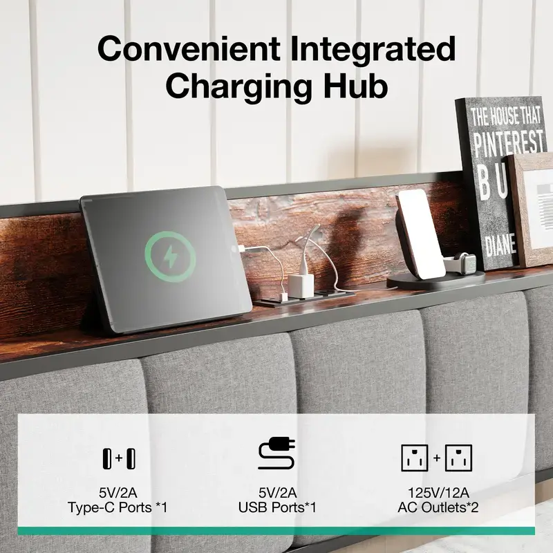 ·Stay connected with our built-in charging hub. It features 2 AC outlets, 1 USB port, and 1 Type-C port. Charge your smartphone, tablet, or laptop directly from your bed. No extra adapters or extension cords needed.