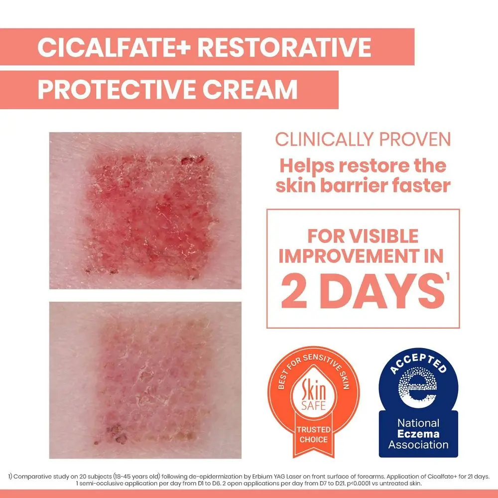 **Comparative study on 20 subjects (18-45 years old) following de-epidermization by Erbium YAG Laser on front surface of forearms. Application of Cicalfate+ for 21 days. 1 semi-occlusive application per day from D1 to D6. 2 open applications per day from D7 to D21. p