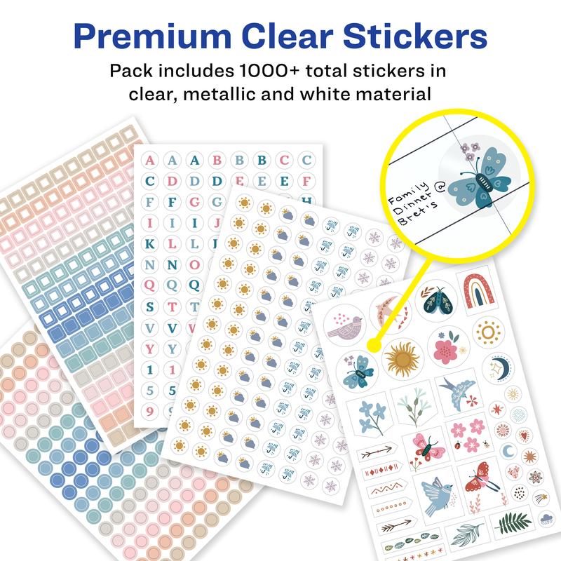 Stay focused and organized with the Avery 6777 Productivity Planner Sticker Pack. With 15 sheets of 1,094 journaling stickers and planner stickers, there's a variety of useful designs with the perfect balance of aesthetic and function. This pack includes a range of stickers for planners such as to-do lists, notes, reminders, and more. There's also a fun variety of quote stickers including motivational phrases like "Life is tough, but so are you" and "Be kind to yourself." Sheets of icon stickers are also included to track weather, mood, and more. You can also use simple square and circle stickers to highlight important dates and color code. The stickers are printed on a mix of premium clear, metallic, and white sticker material.